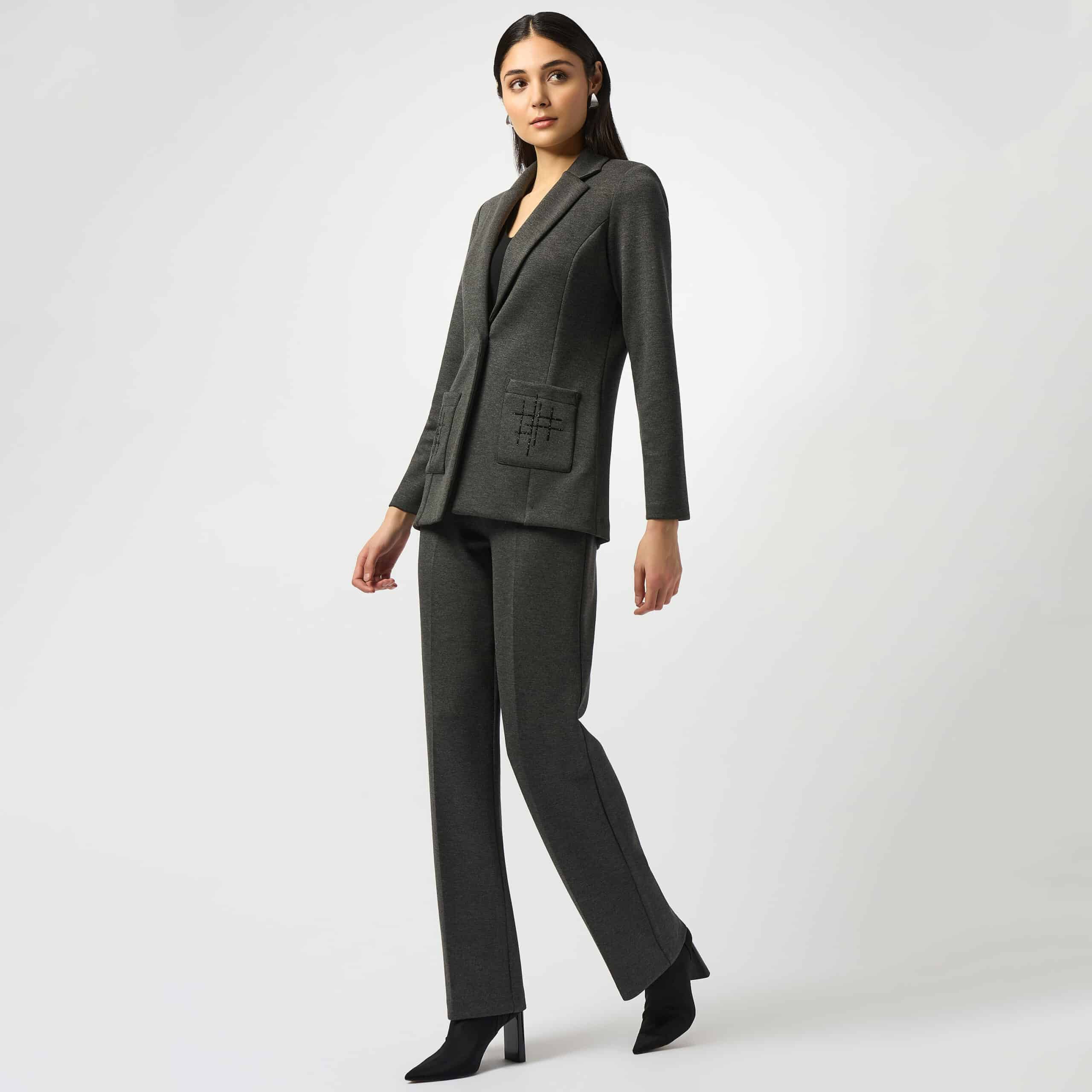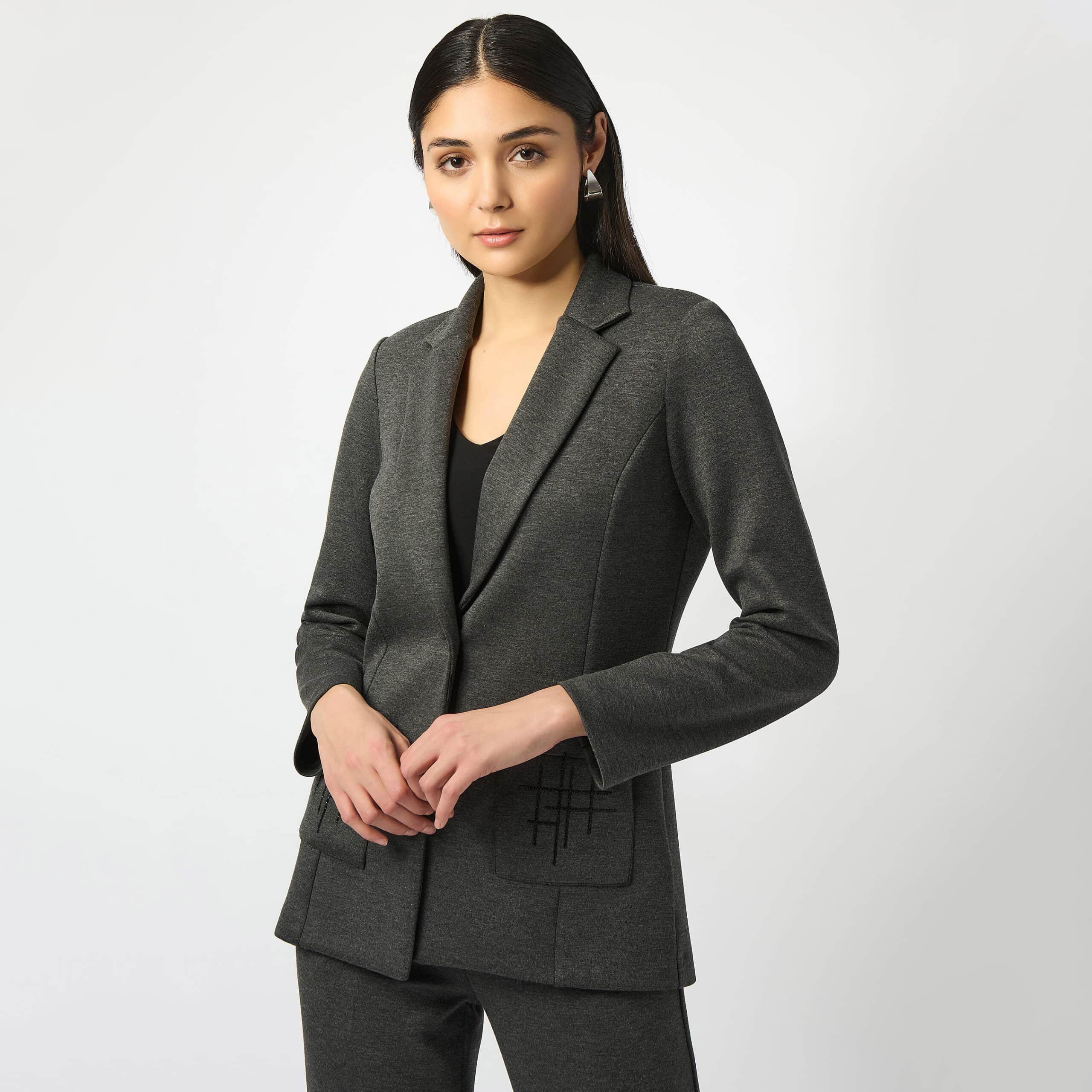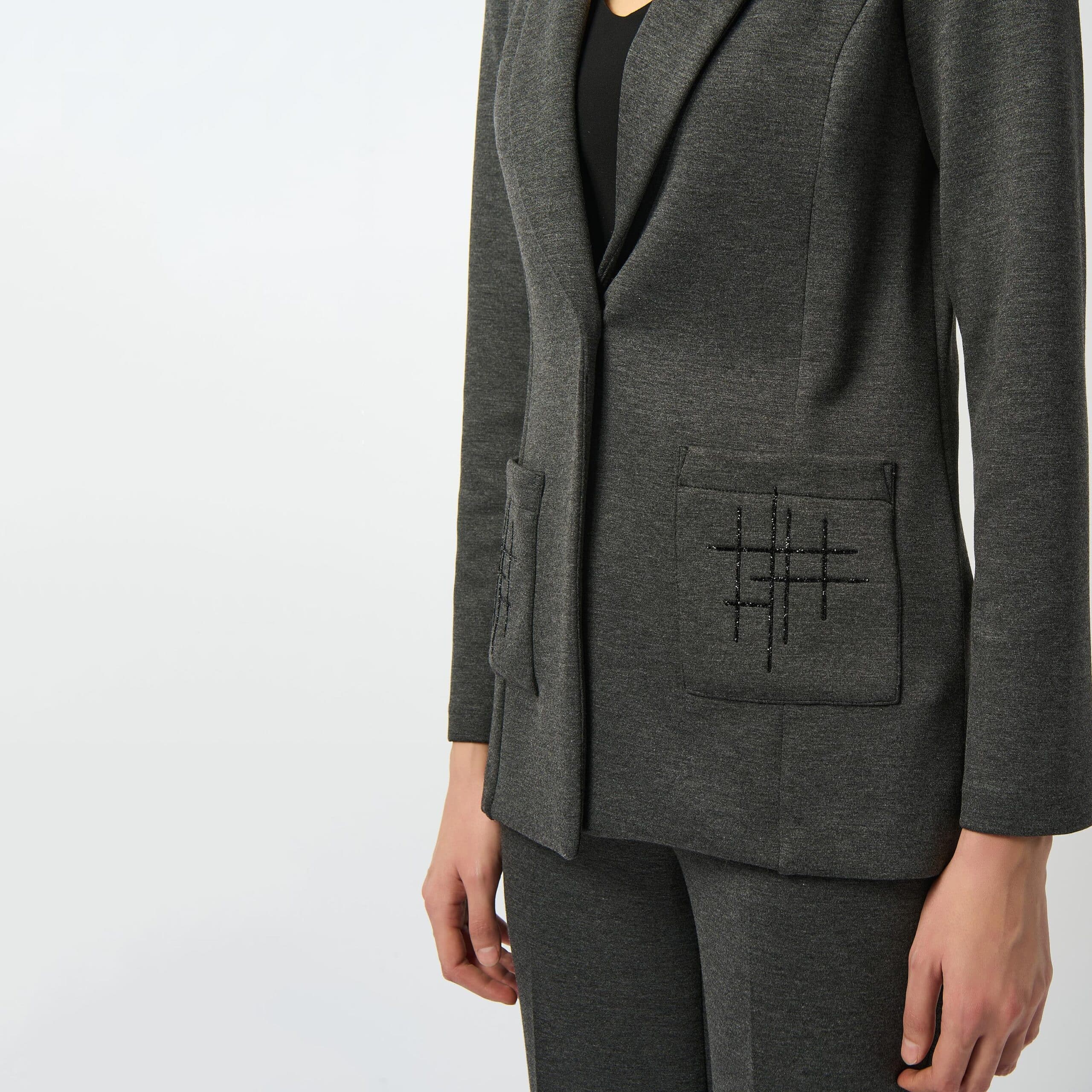 Poches plaquées avec un motif de pierres noires en contraste, disponible gris charcoal.