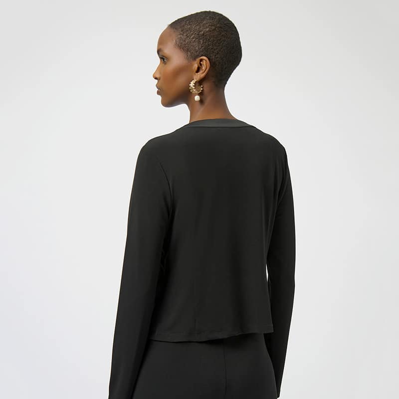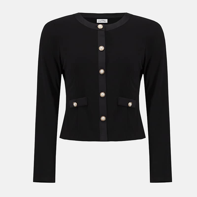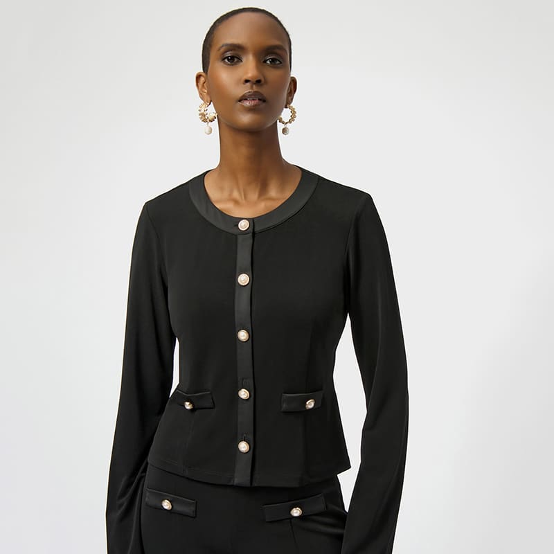 Modèle ajusté, boutonnières satinées avec boutons perlés, disponible noir.