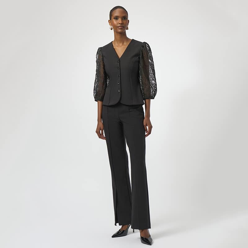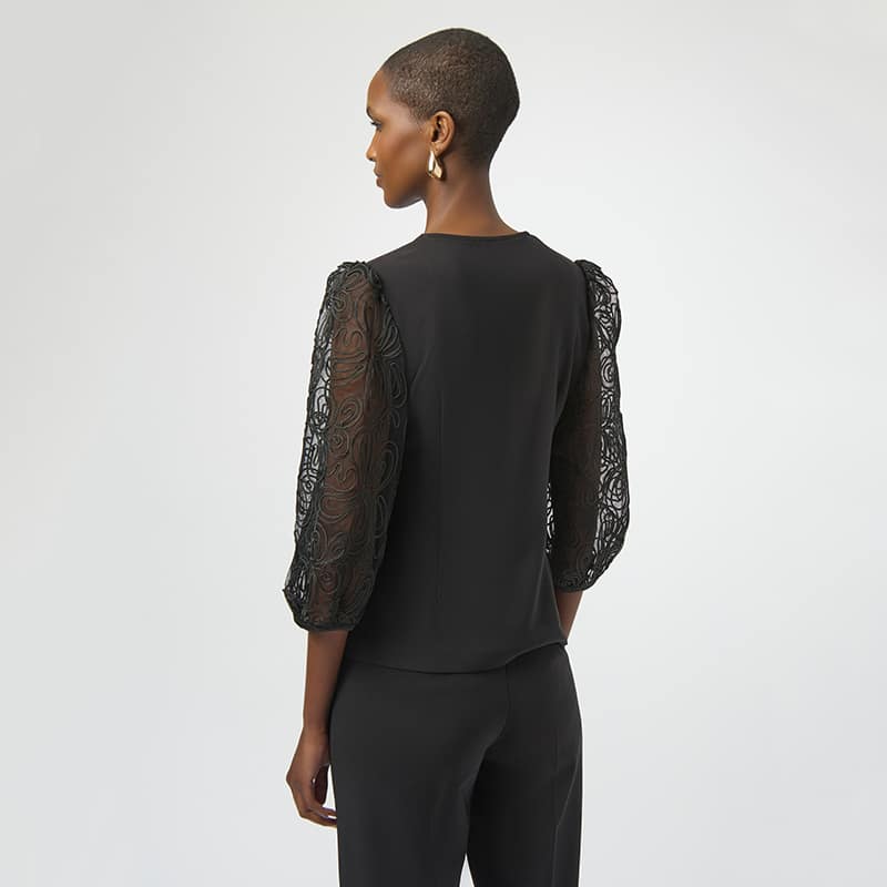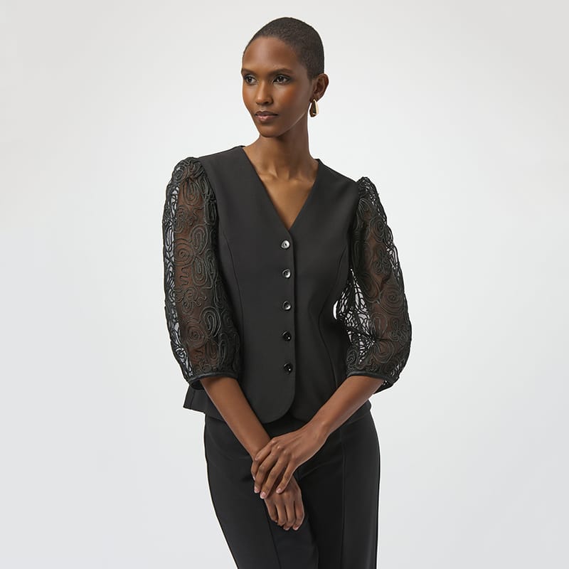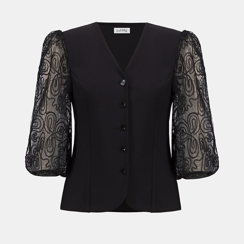 Blazer chic, en tissus soyeux avec de belles manches 3/4 en organza brodé plissé sur le dessus de l’épaule.