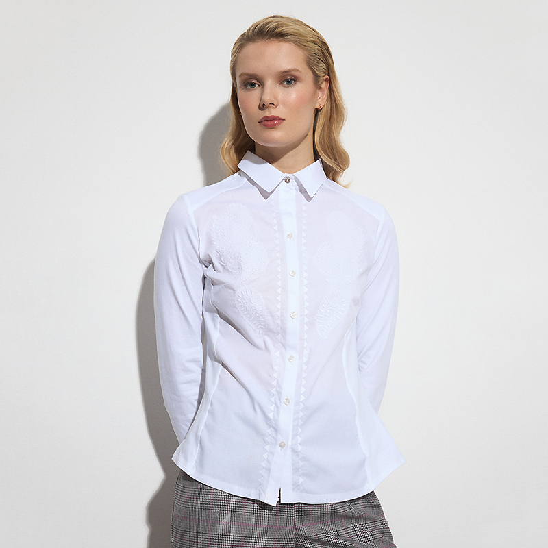 Col et devant du chemisier en coton extensible brodé ton sur ton, blanc.