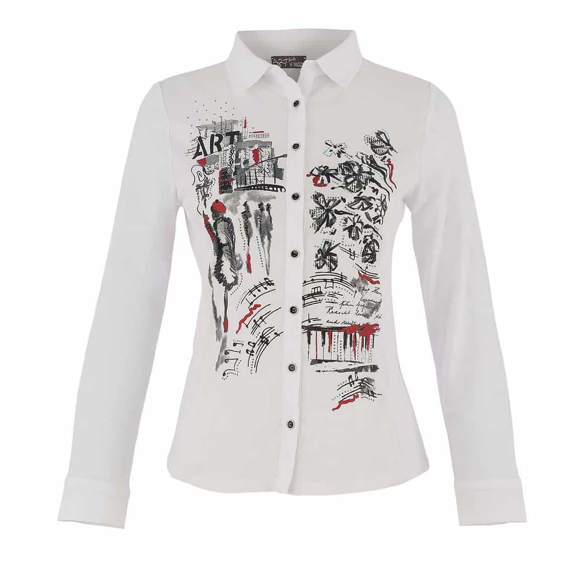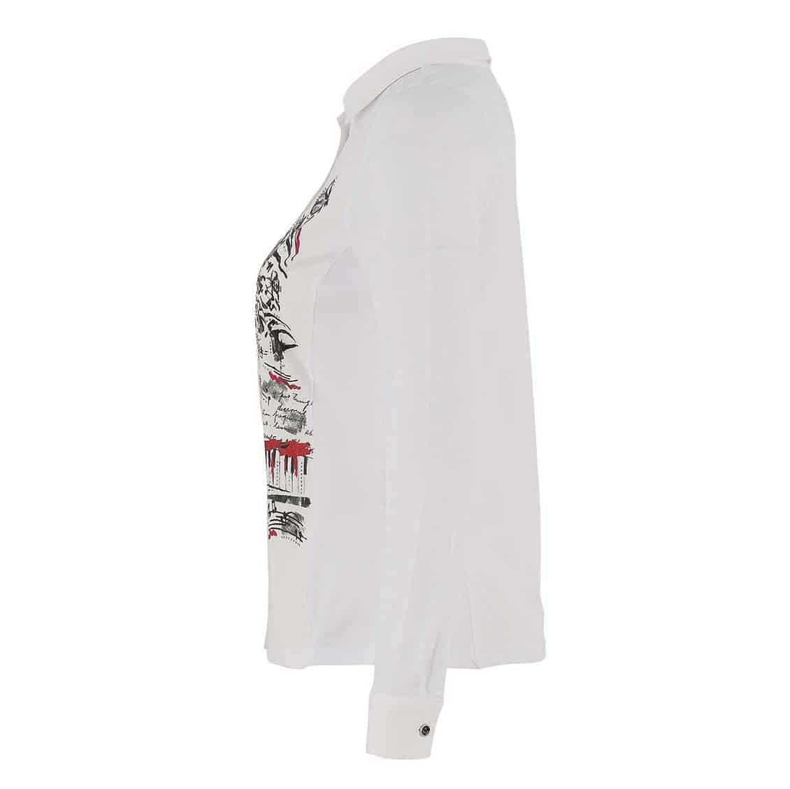 Modèle ajusté blanc, motifs artistiques noir, gris et rouge au devant, le dos et les manches sont en jersey extensible pour un maximum de confort.