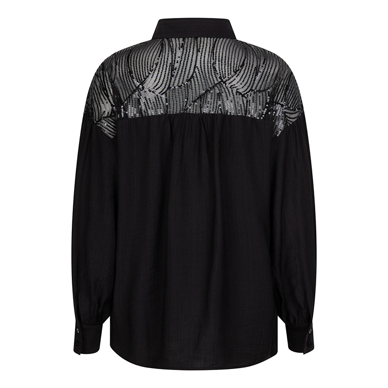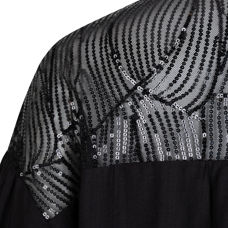 Modèle ample , transparence au haut du dos, sur les épaules en mèches et paillettes, noir seulement.