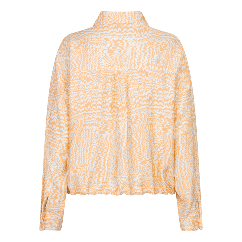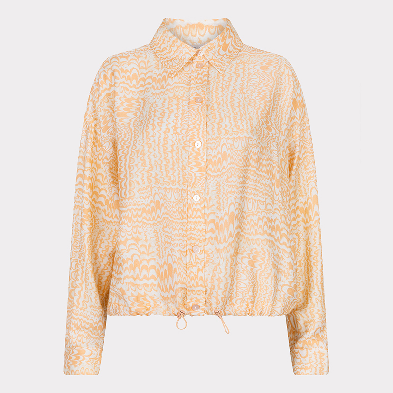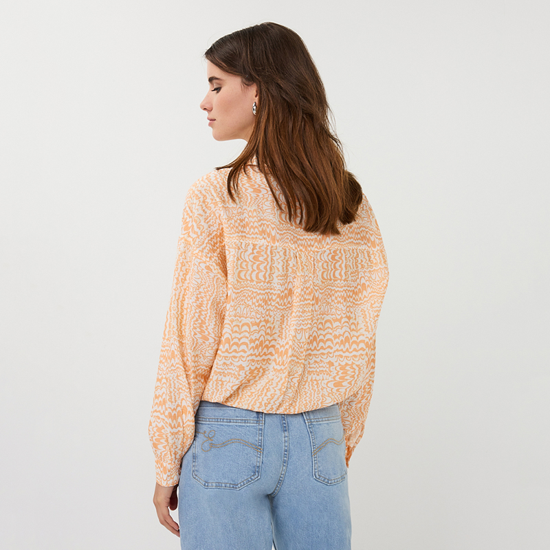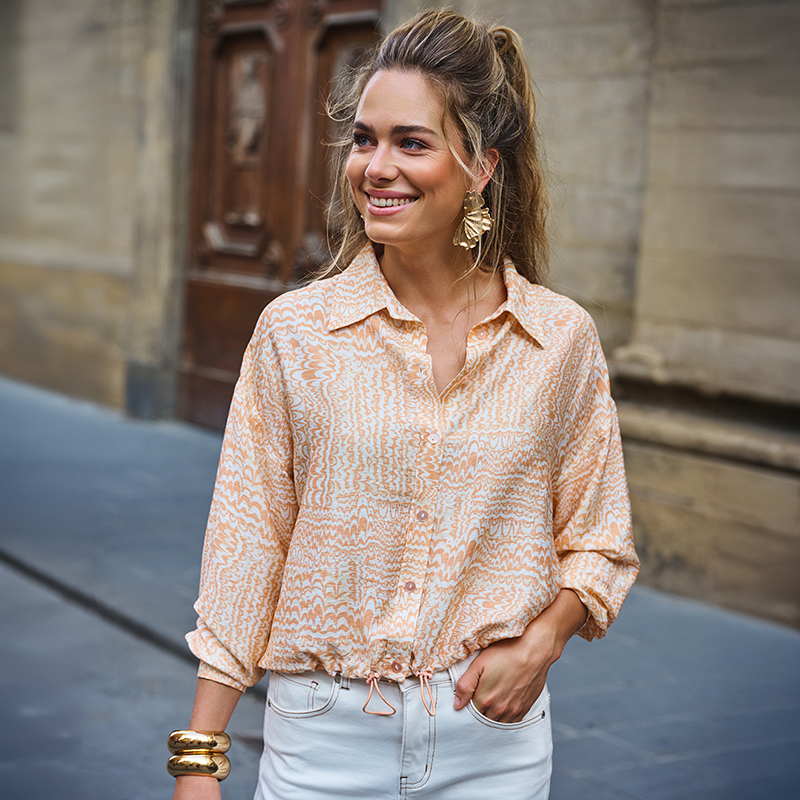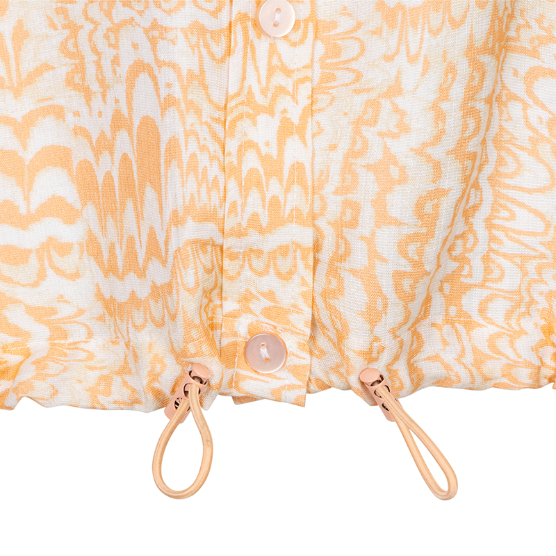 Modèle court, élastique au bas pour permettre un ajustement et créer un effet blousant, imprimée pêche et blanc.