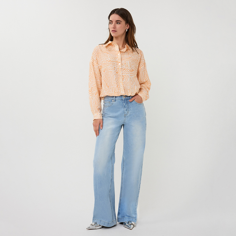 Blouse à manches longues avec coutures d’épaules basses non structurées, col classique au cou.