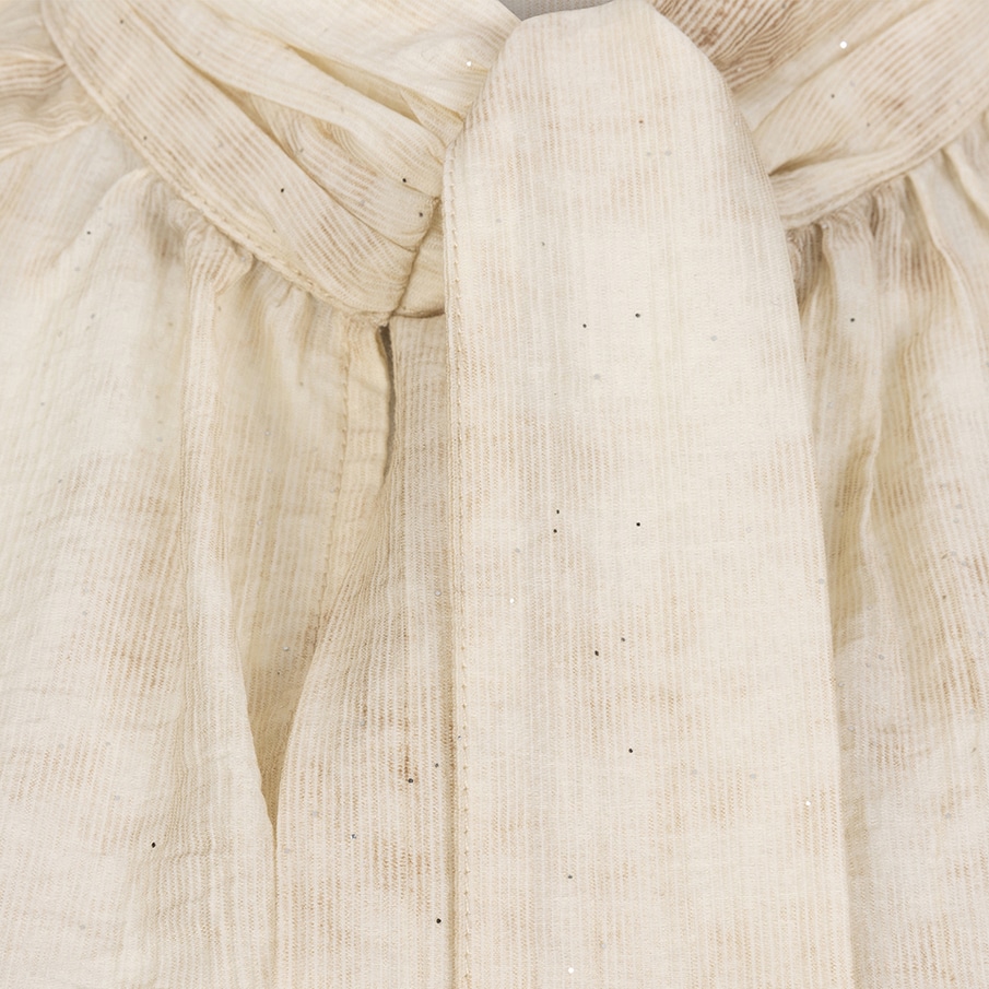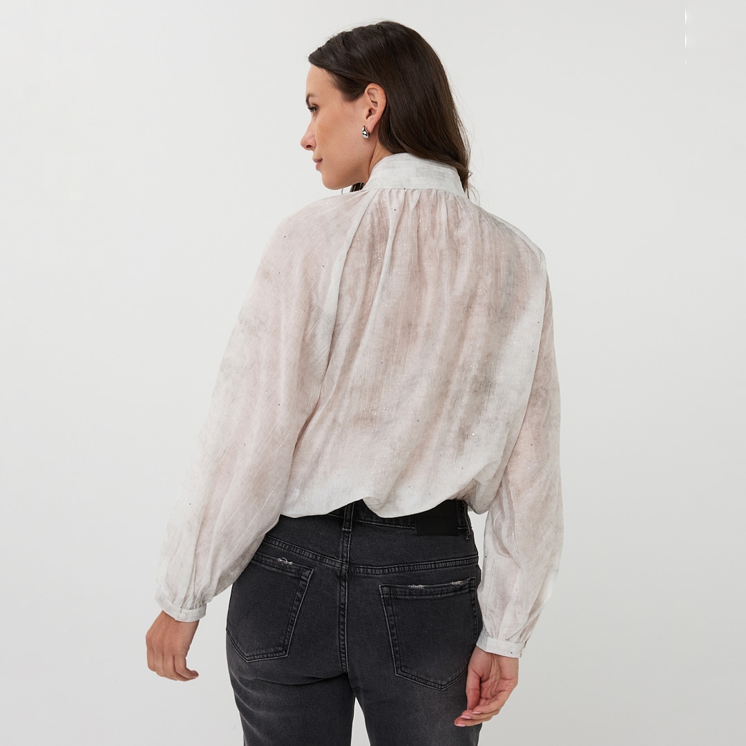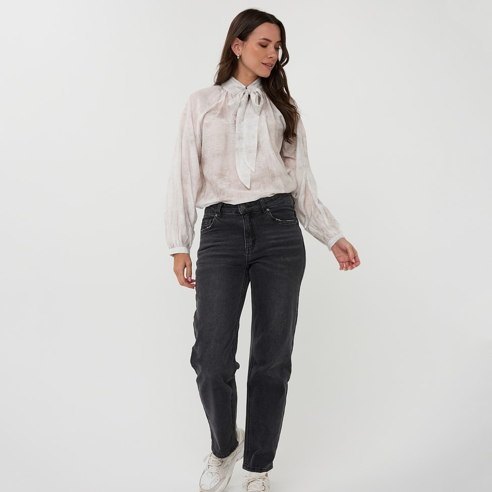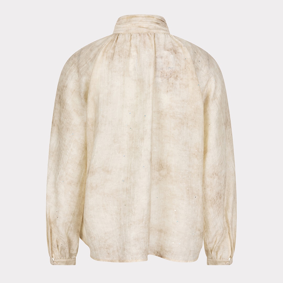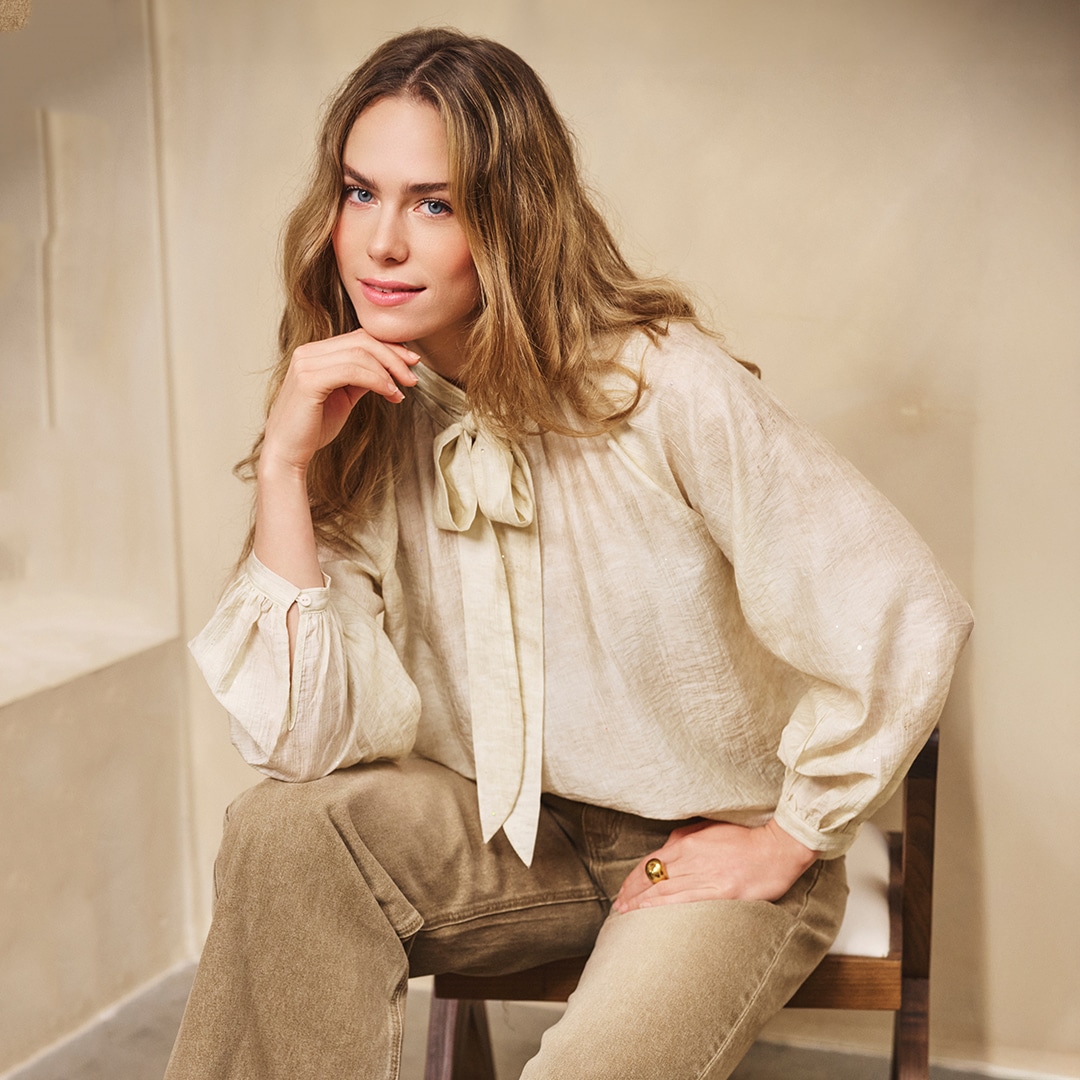 Blouse légère à manches longues raglan et ample, col en pointe noué avec un ruban pour un look très féminin.