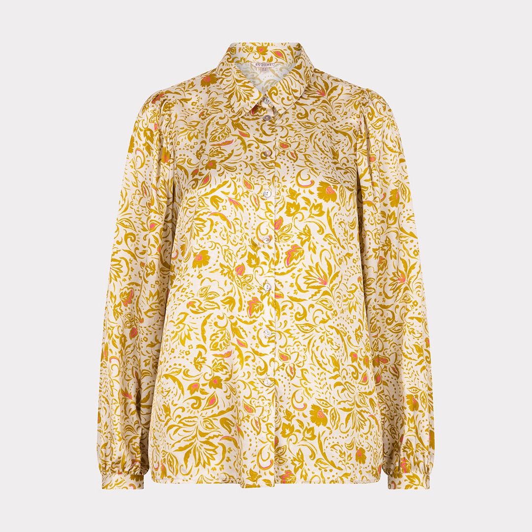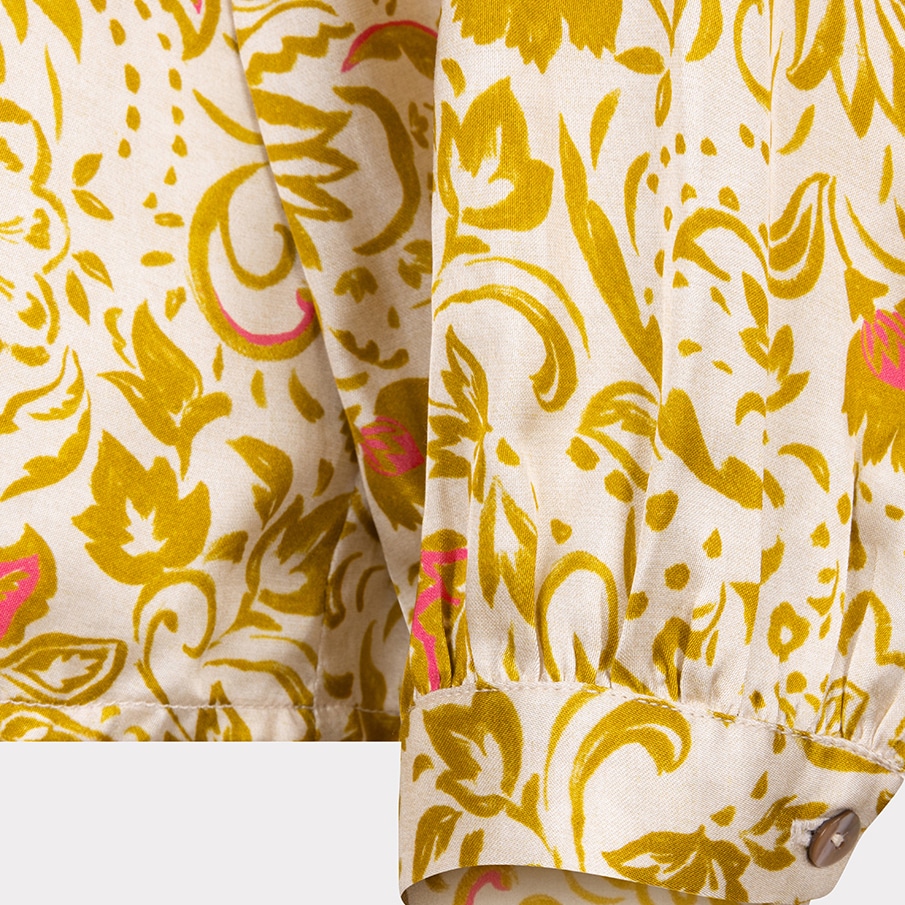 Modèle droit sans pinces, tissus satiné, col chemisier classique au cou, imprimé.