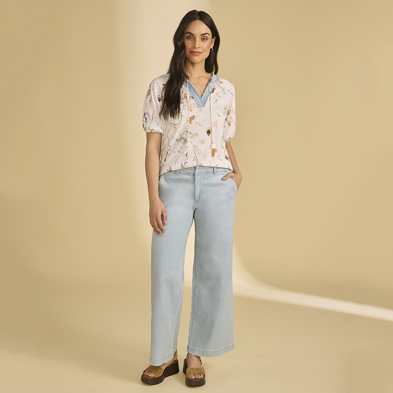 Modèle court et droit, encolure an pointe bordée de denim pâle, imprimé sur fond ivoire.