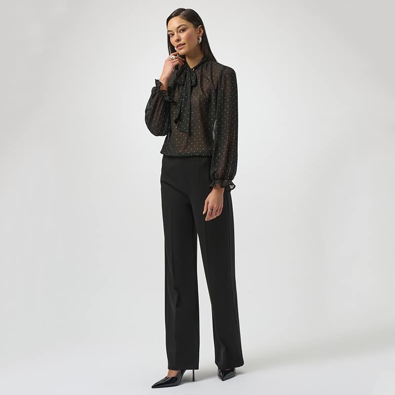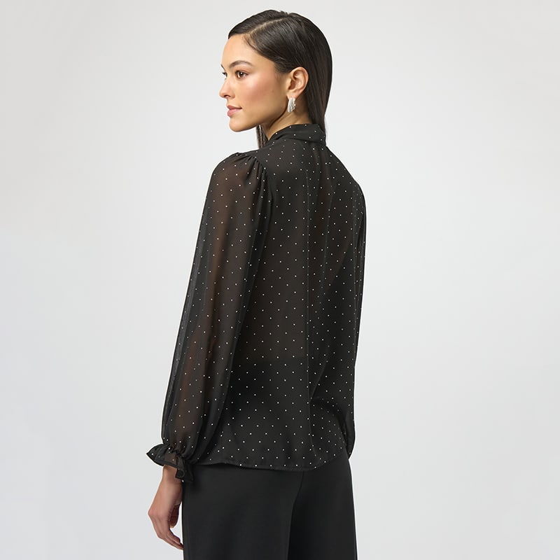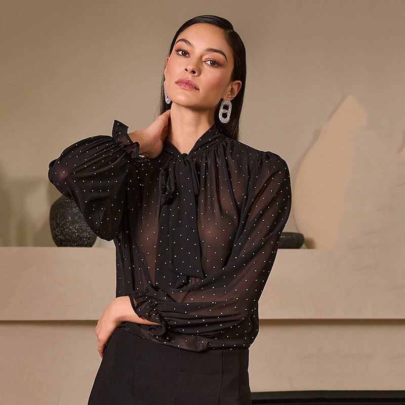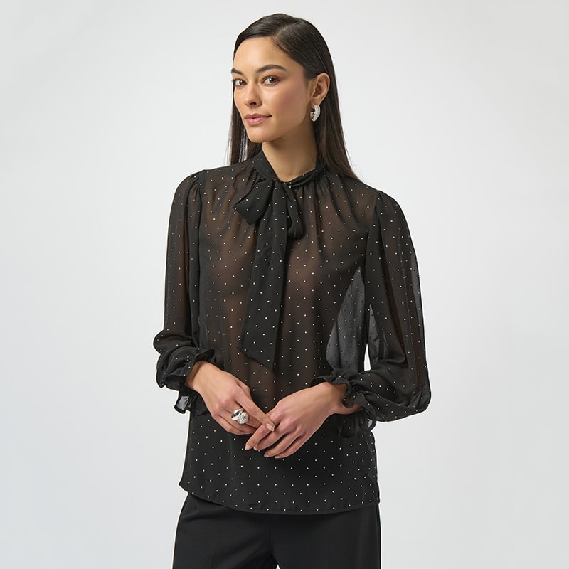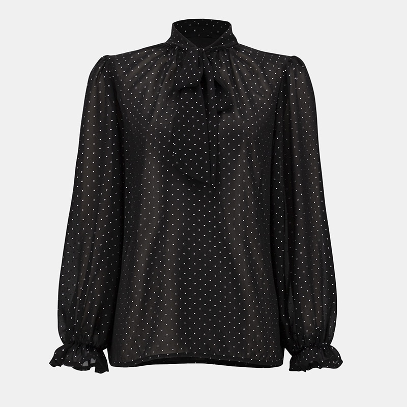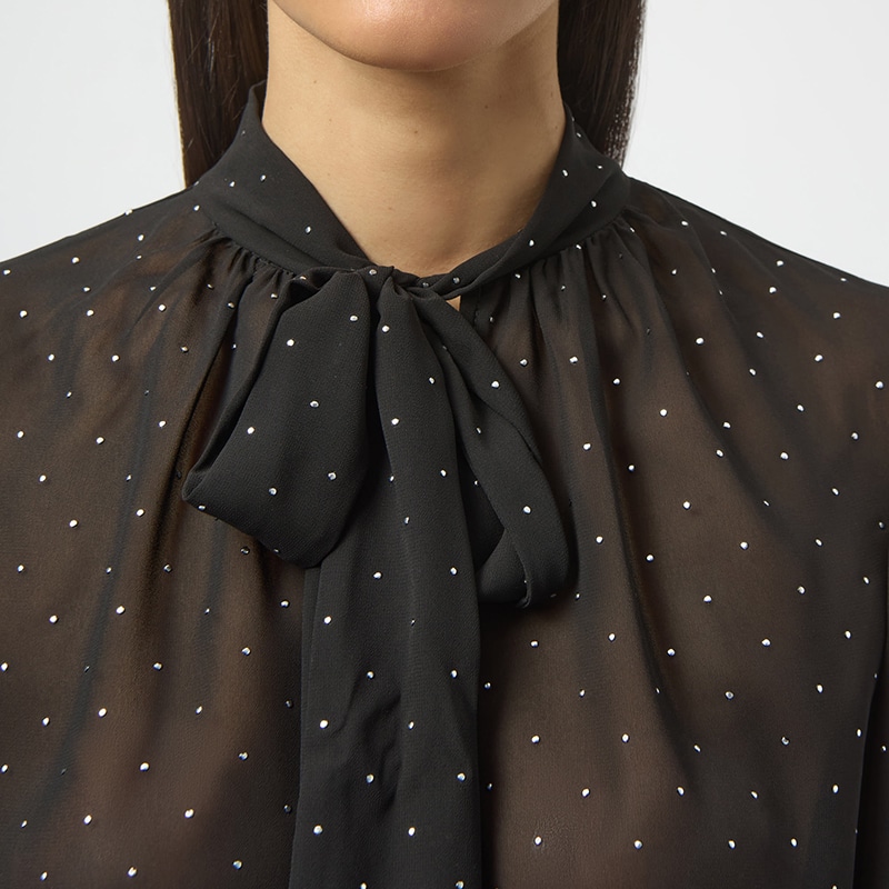 Magnifique blouse en voilage à manches longues avec poignets élastique et petit col montant fini en pointe avec une cravate.