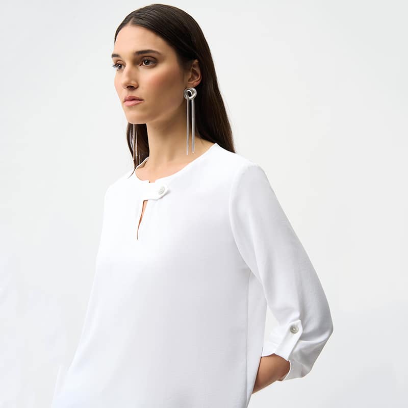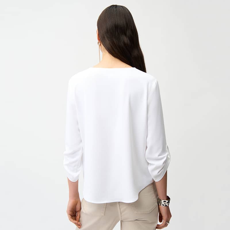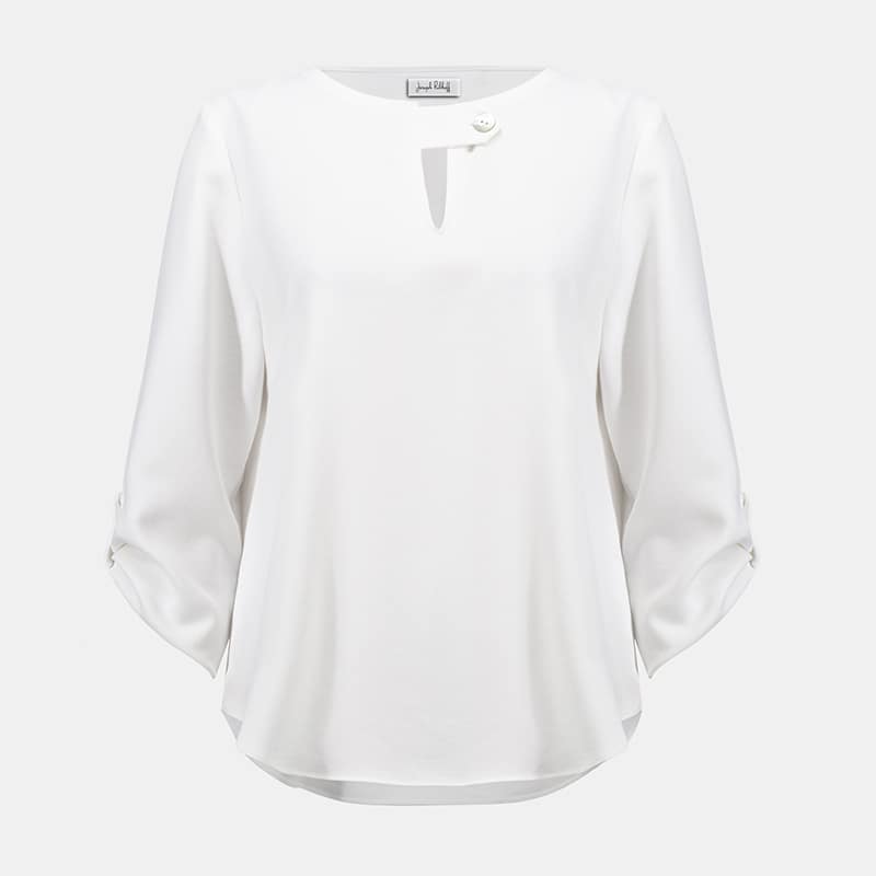 Blouse à manches 3/4 drapée avec une patte boutonnière, encolure ronde ouvert en pointe.