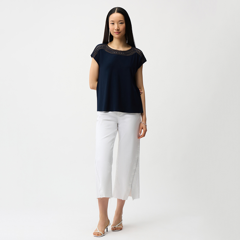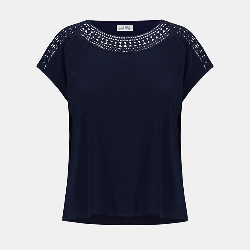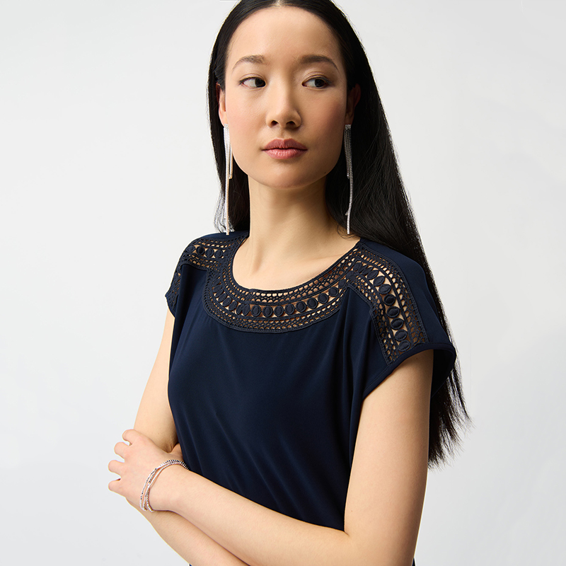 Encolure bateau rehaussée de guipures au niveau du col et des épaules.