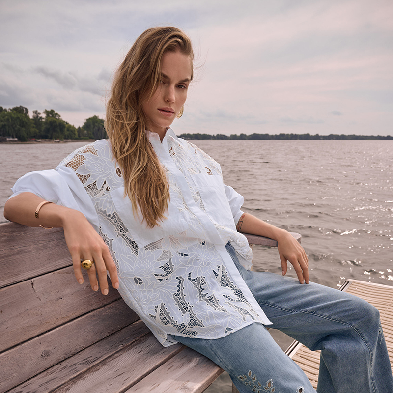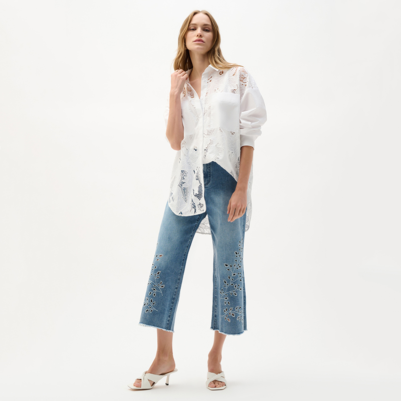 Cette blouse en coton associe une dentelle brodée aérienne à des accents structurés au col, à la patte de boutonnage, aux manches et aux poches.