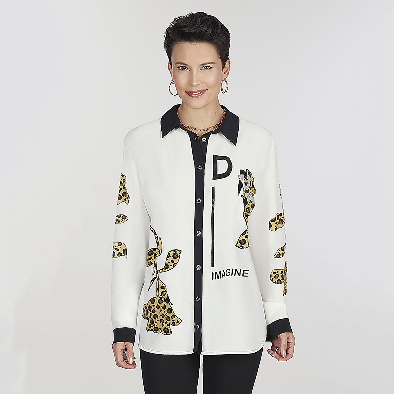 Modèle droit blanc et noir avec des motifs animaliers au dos, au devant et sur les manches.