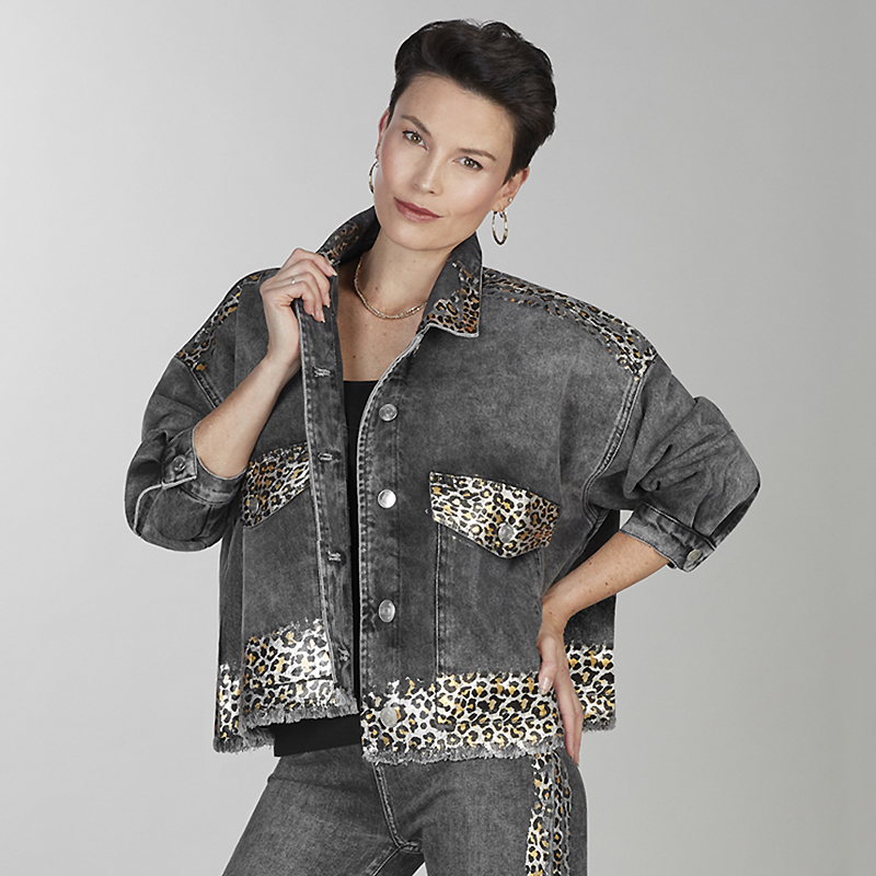 Jacket en denim gris charcoal à manches longues, col classique.