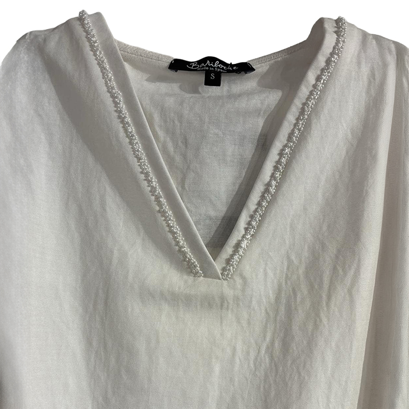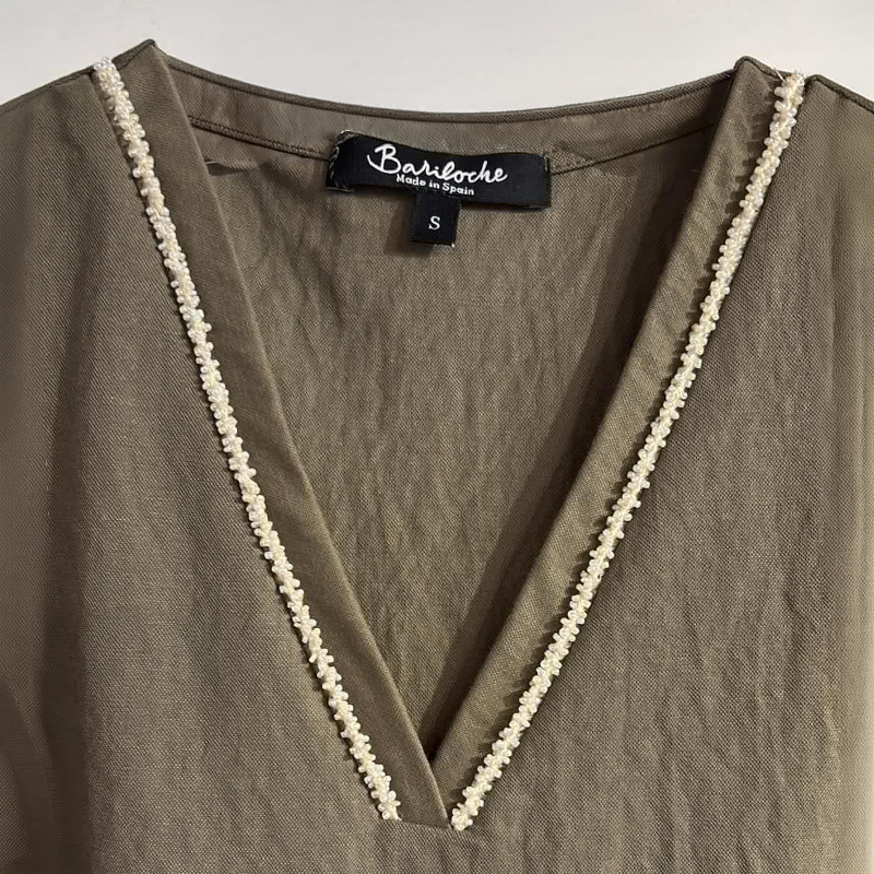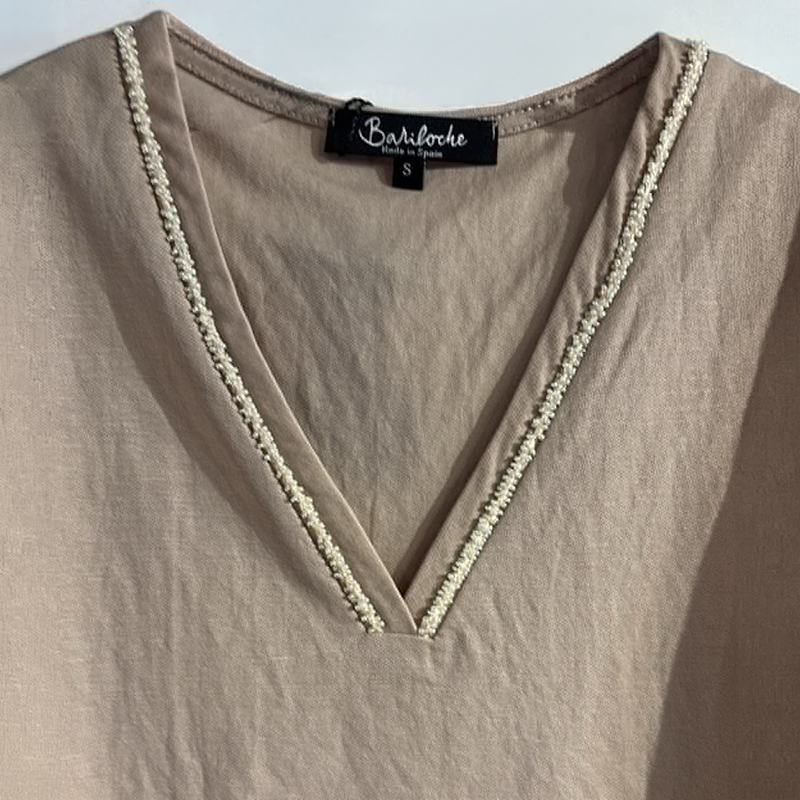 Blouse sans manches, bretelles larges, encolure en pointe avec détails de petites perles ton sur ton.