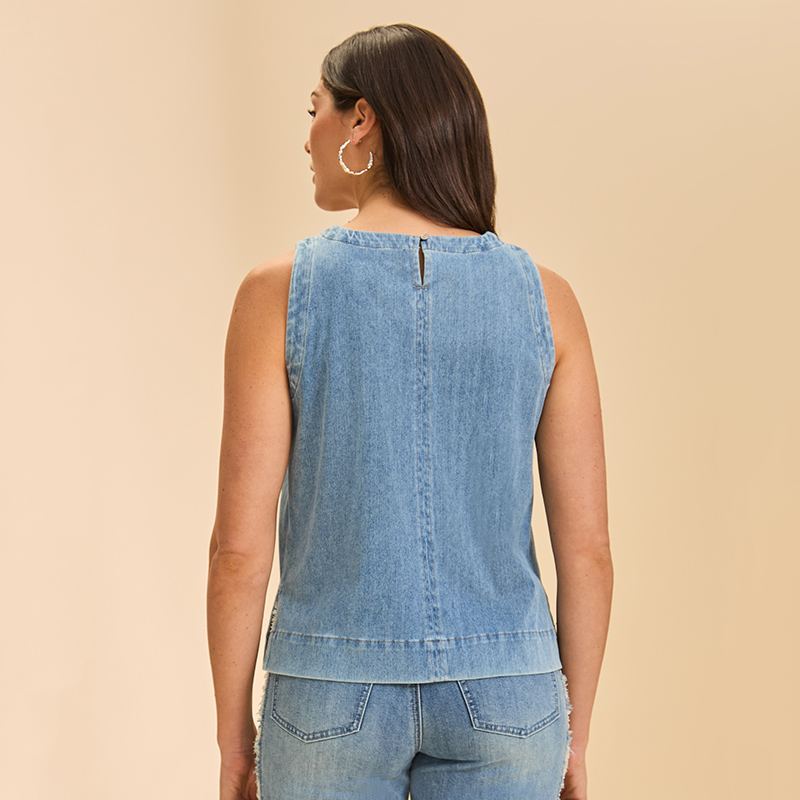 Camisole à bretelles larges, encolure ronde près du cou, ouverture au dos avec un petit bouton.