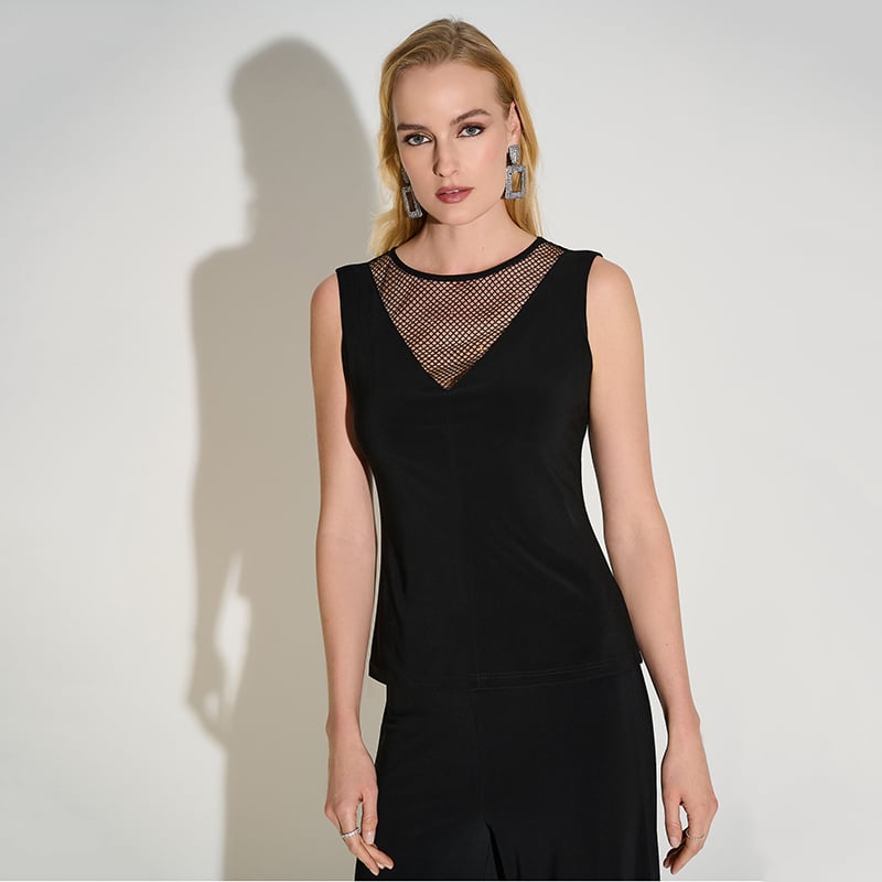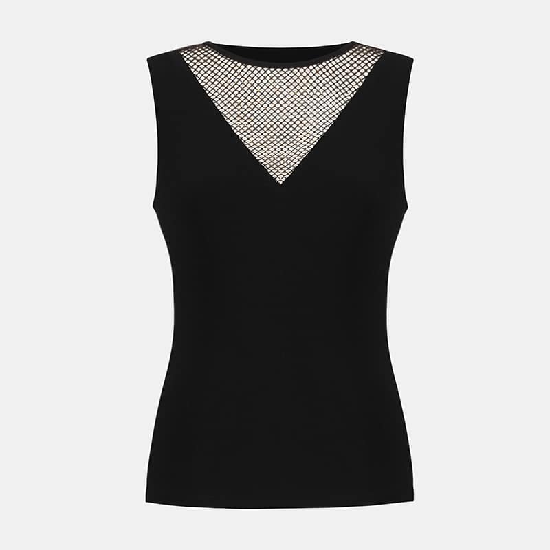 Camisole à bretelles larges, encolure ronde avec une pointe en filet noir et de petites pierres bronzes.