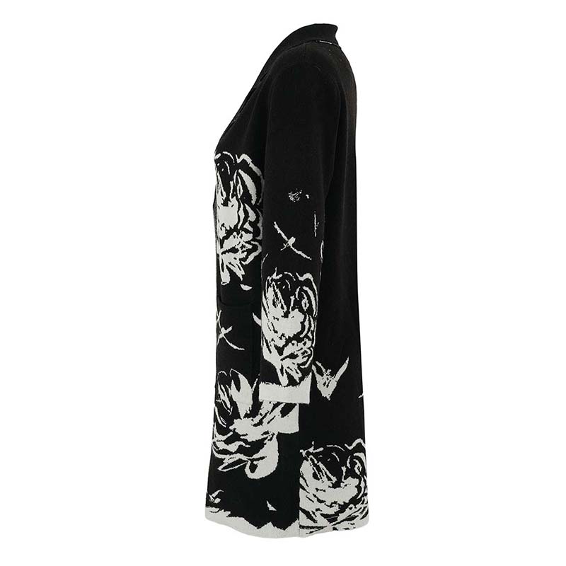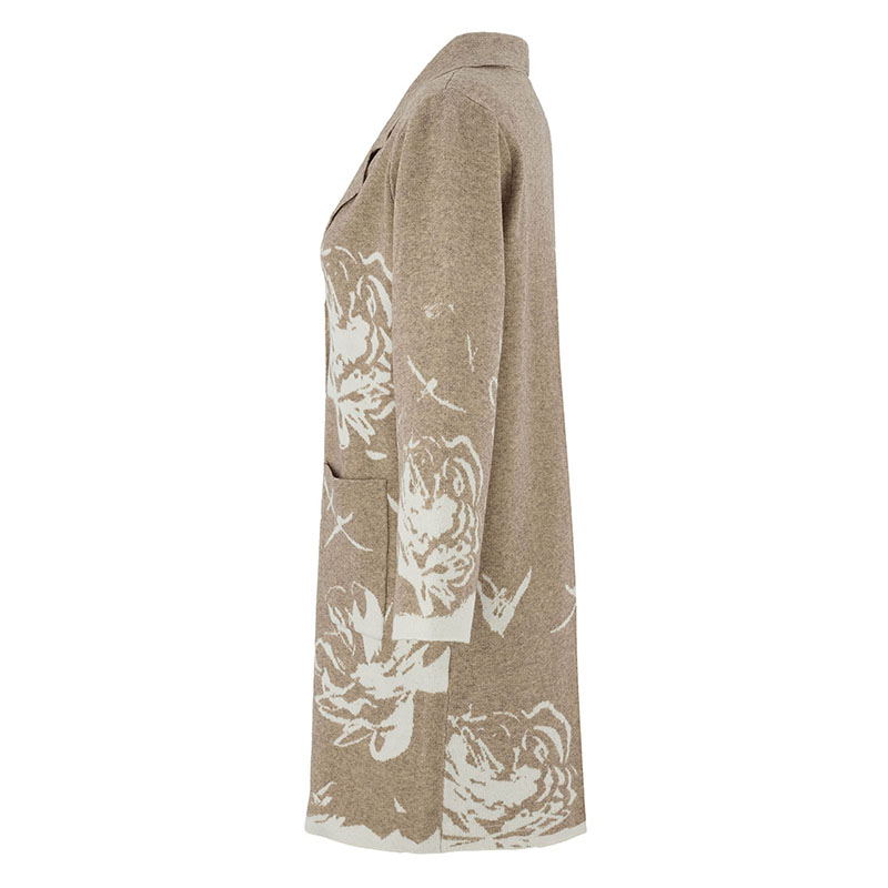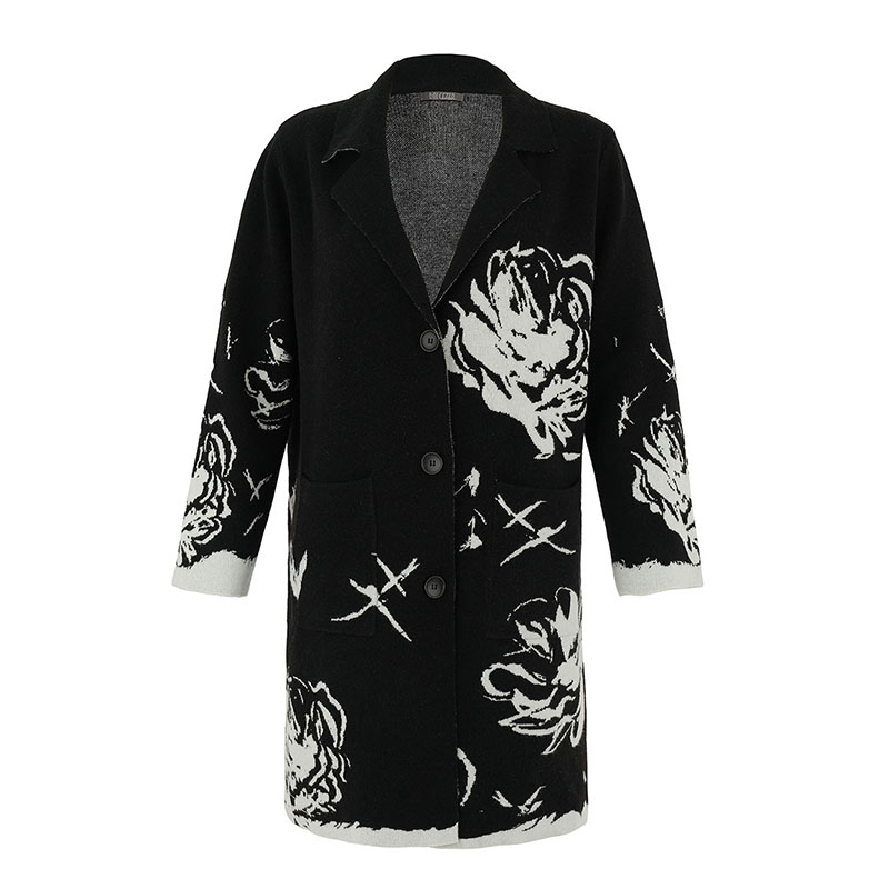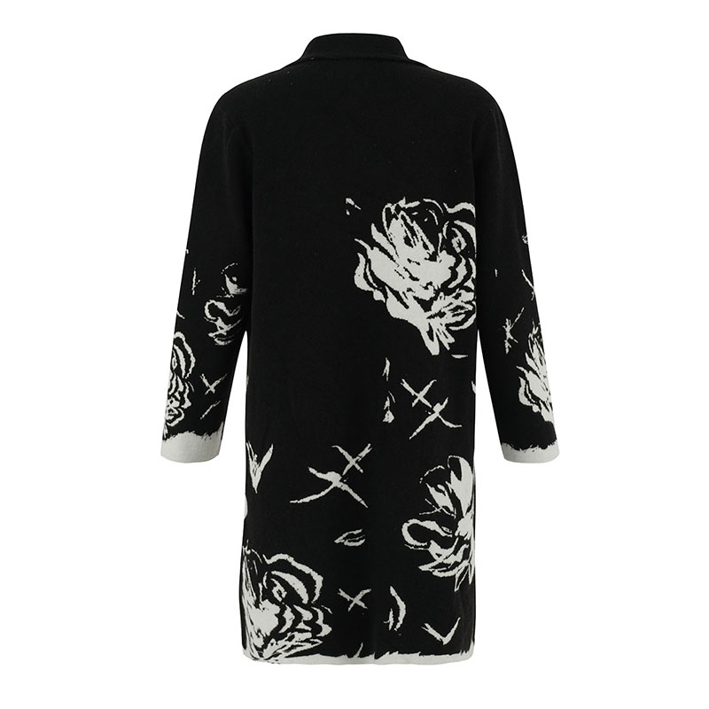Cardigan long, col classique ouvert avec trois boutons à manches longues.