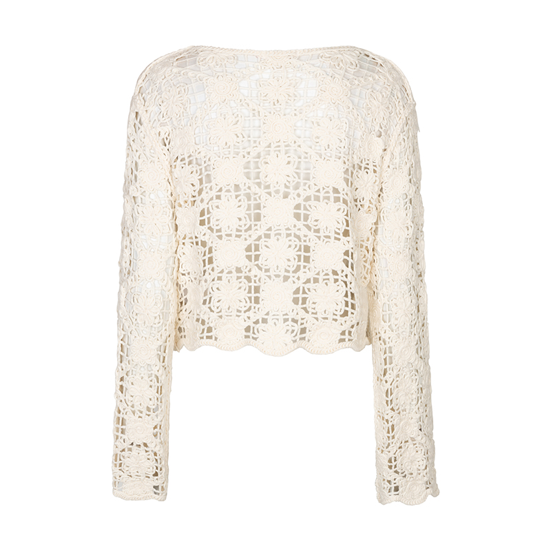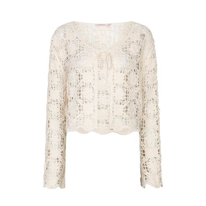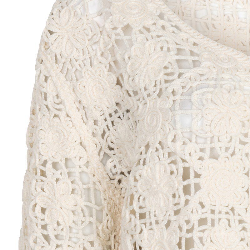 Cardigan en tricot ajouré à manches longues, encolure en pointe.