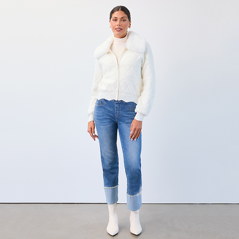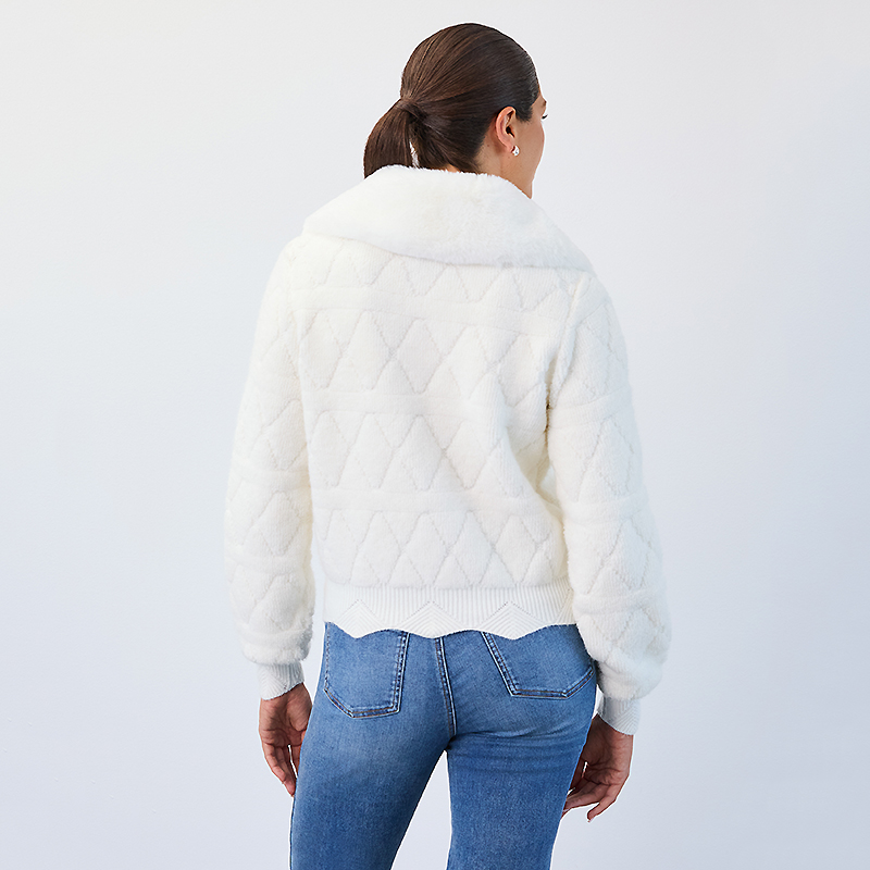Cardigan en tricot de chenille, fermeture éclair, col en fausse fourrure détachable, col rond dessous.