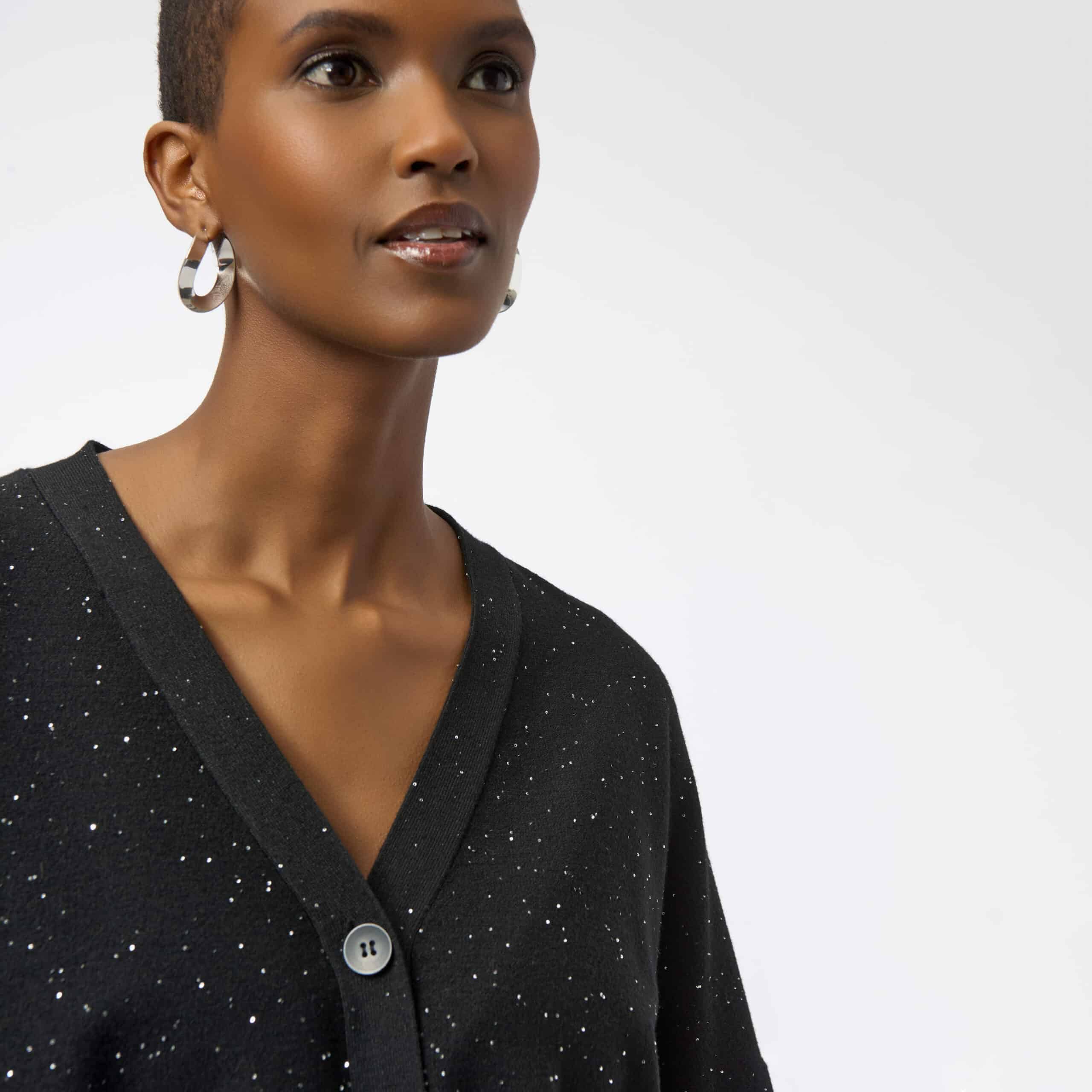 Cardigan en tricot doux à manches longues avec coutures d’épaules basses, sans col en pointe.