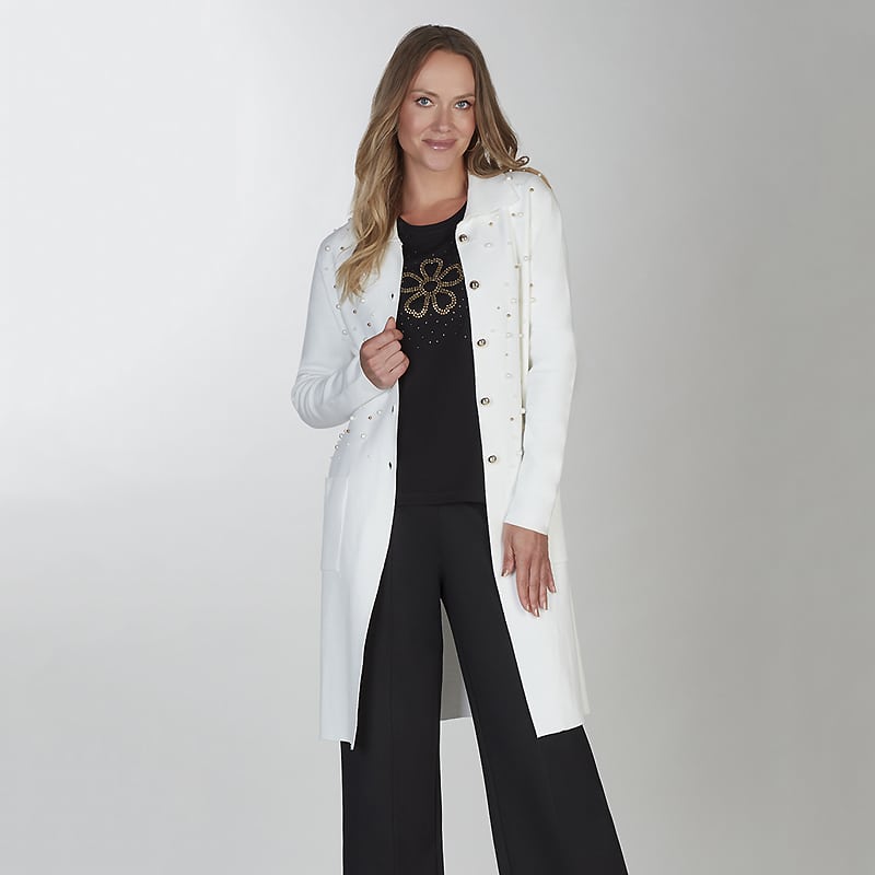 Modèle droit, poches plaquées, jolies perles ivoire et dorées au devant pour une touche féminine.