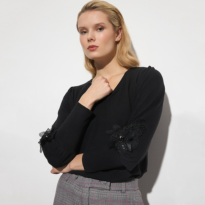 Poignets ajustés, jolies fleurs en relief ton sur ton.