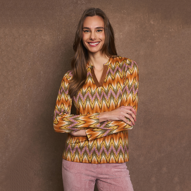 Chandail en jersey léger à manches longues, sans col fini en pointe.