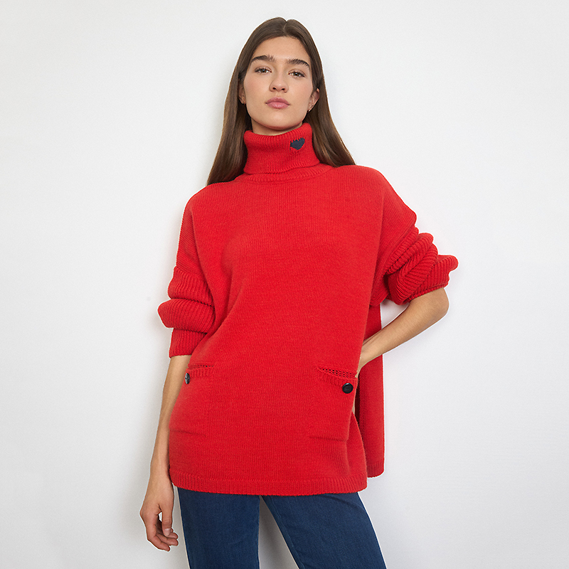 Modèle droit style tunique ouvert de chaque côté, deux poches plaquées aux hanches, petit cœur ♥️ contrastant au col.