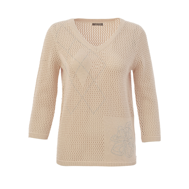 Chandail en tricot de coton ajouré à manches 3/4 avec encolure en pointe.