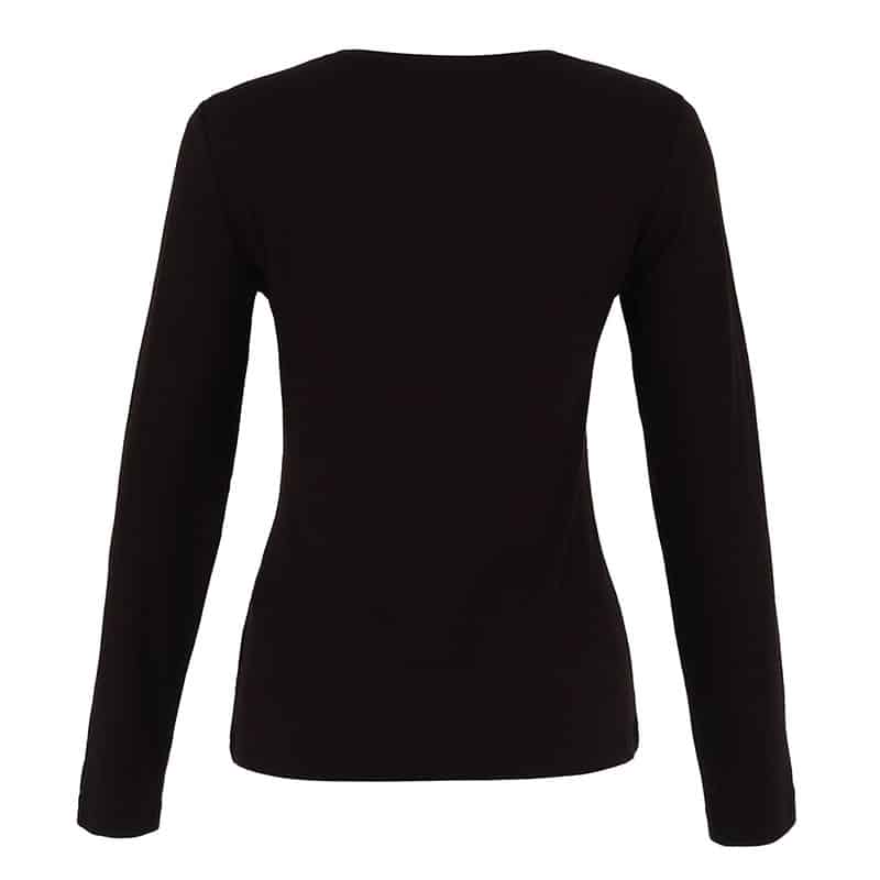Chandail en jersey léger à manches longues, encolure ronde bordé d’un fil noir lustré.