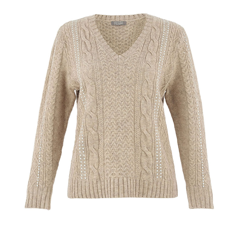 Chandail en tricot câblé à manches longues, encolure en pointe.