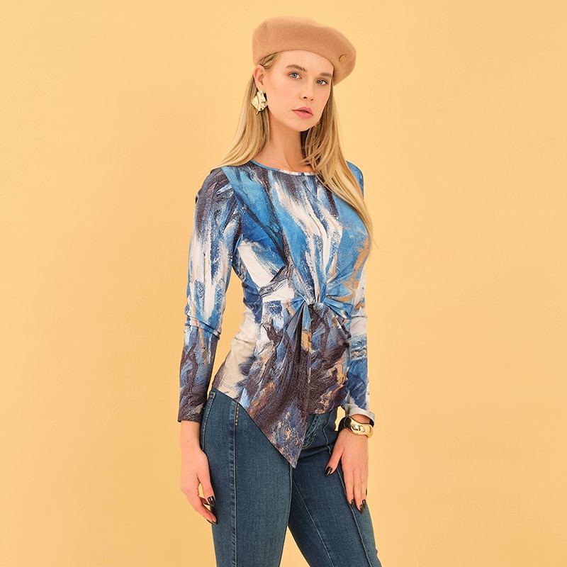 Modèle ajusté au corps, très bel imprimé bleu fait à partir d’une toile de l’artiste peintre « Magella LeBlanc », noué et drapé à la taille.