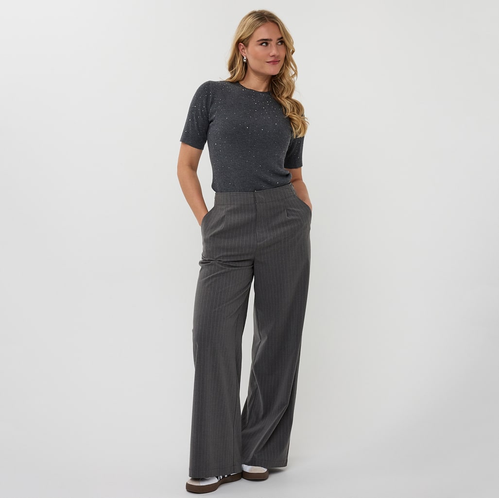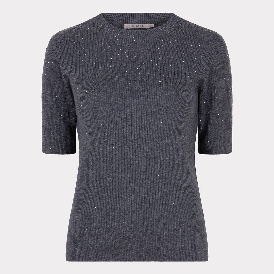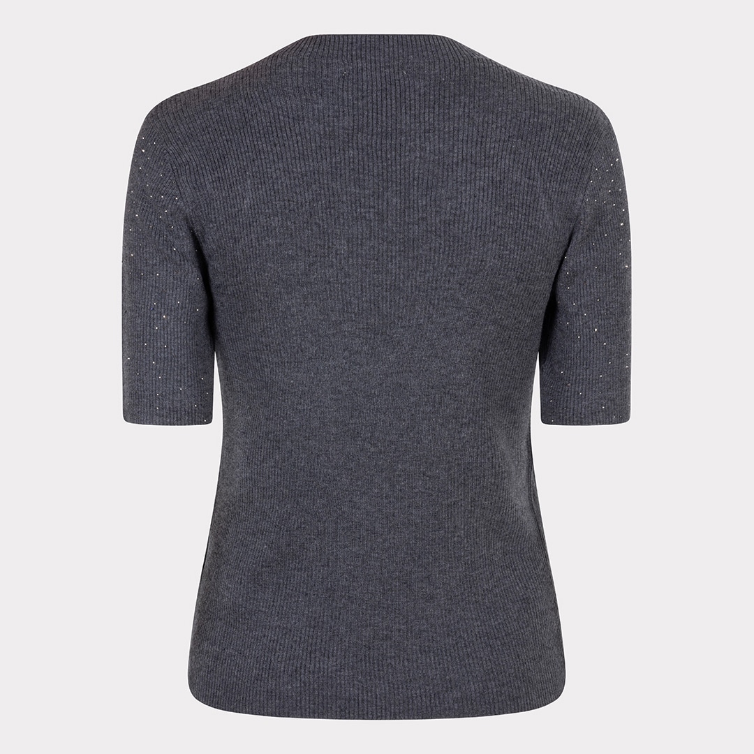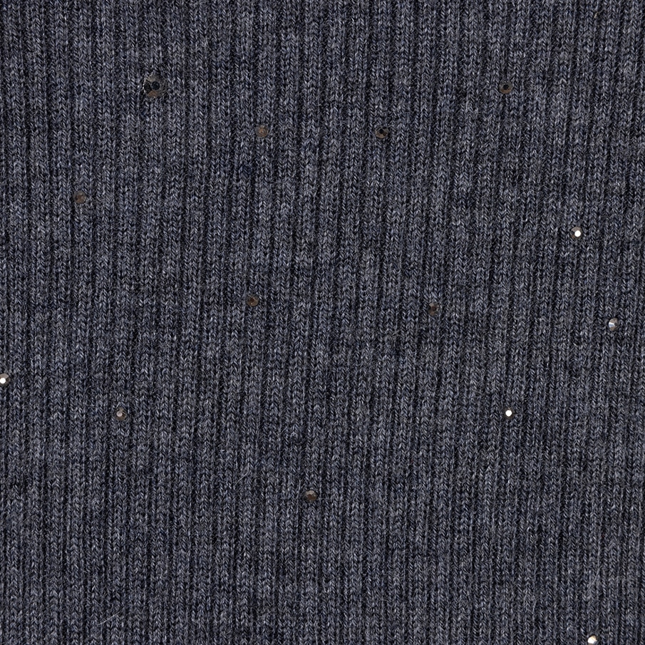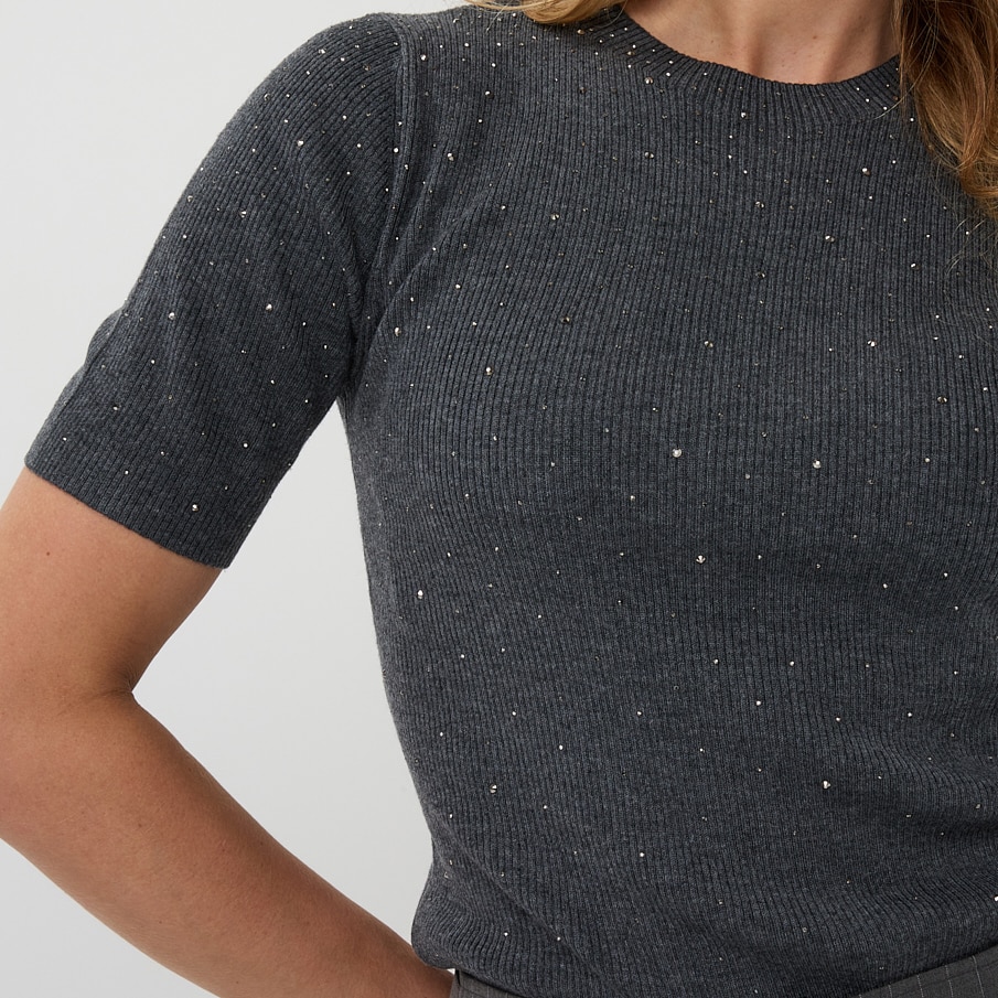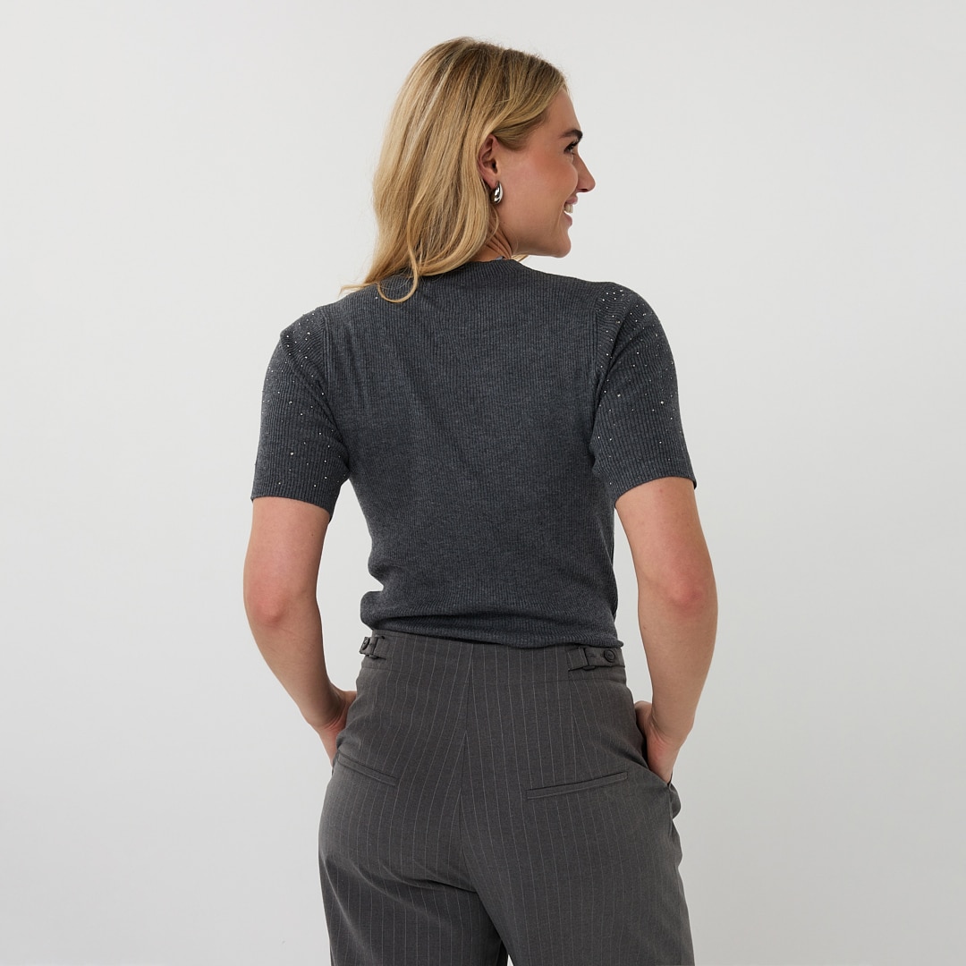 Modèle près du corps, rib dans le tricot charcoal avec des pierres argent foncées.