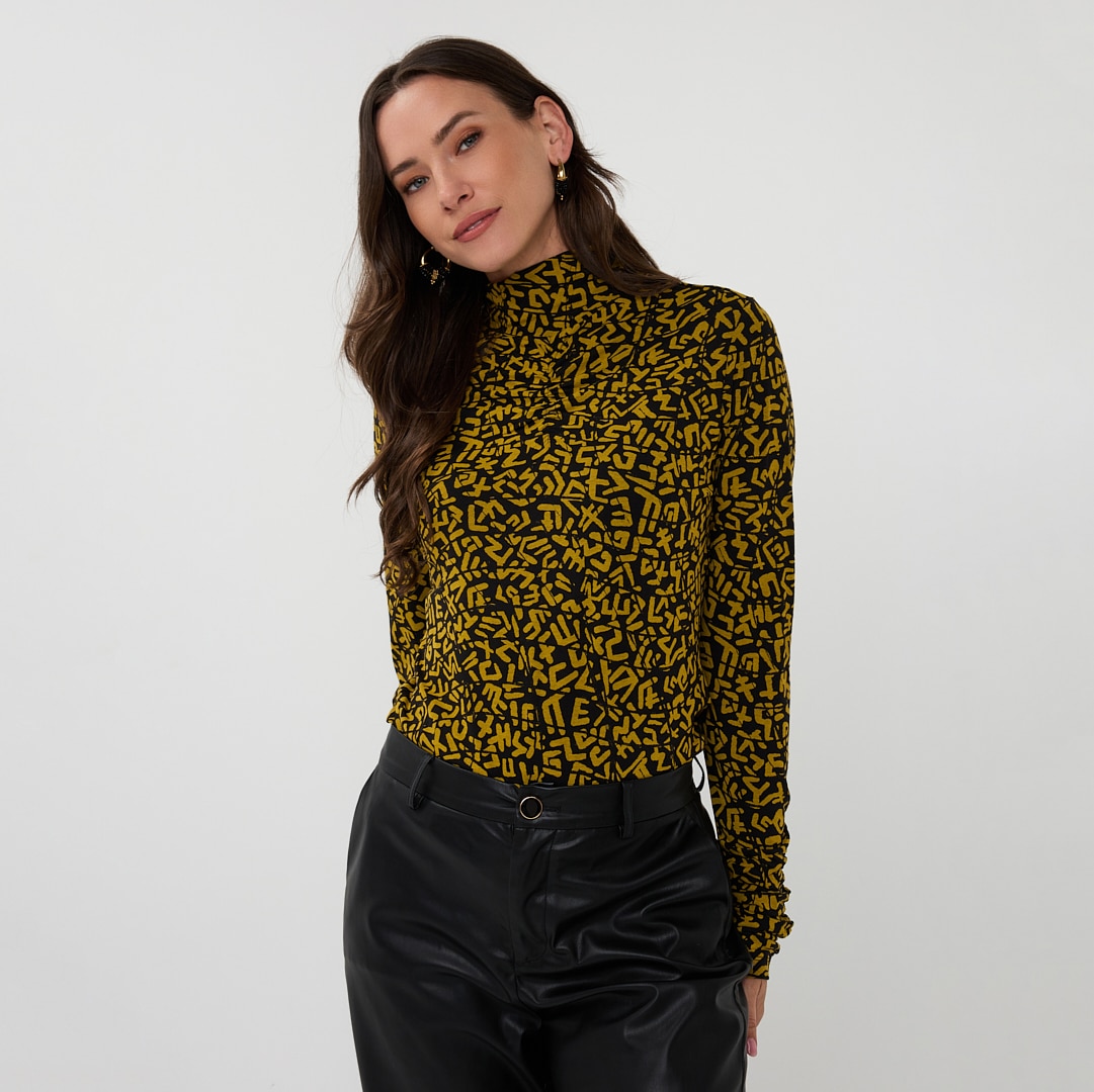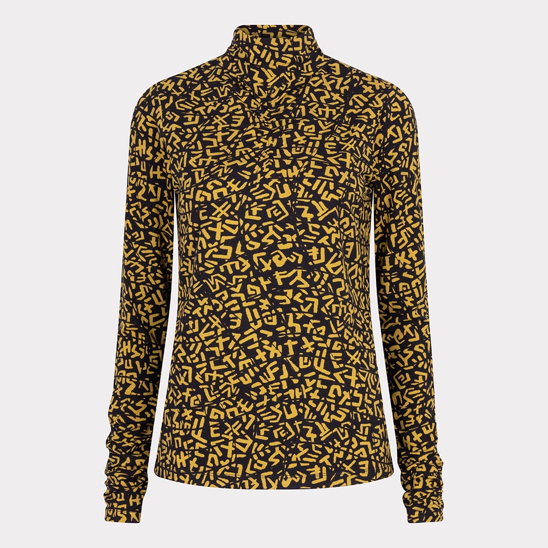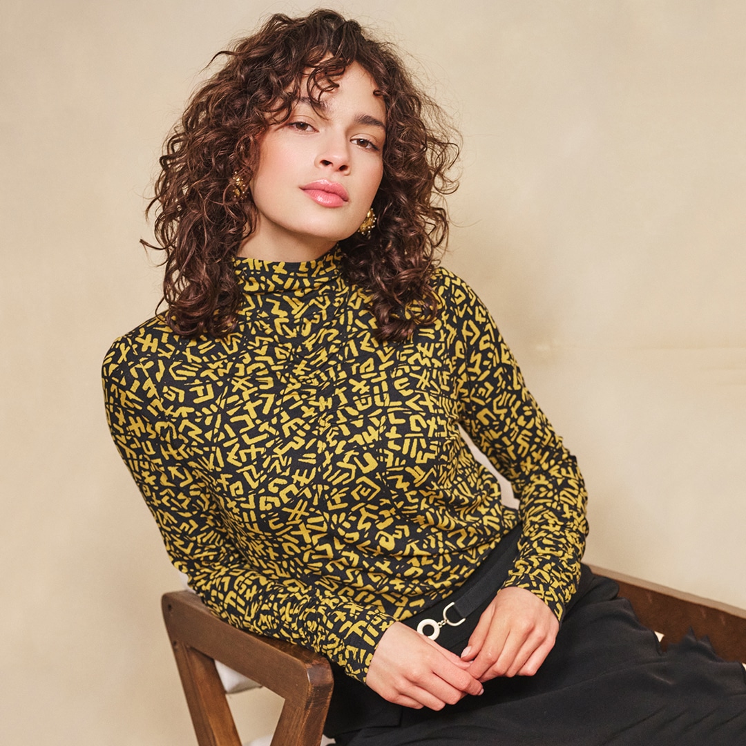 Chandail en jersey à manches longues plissé au poignets, col montant près du cou et plissé devant.