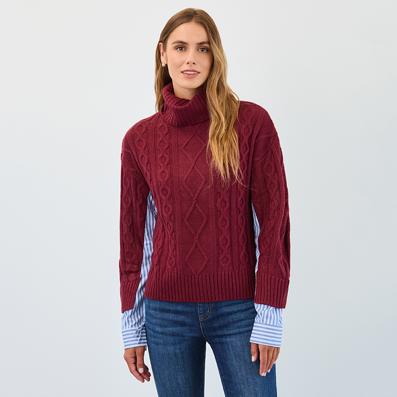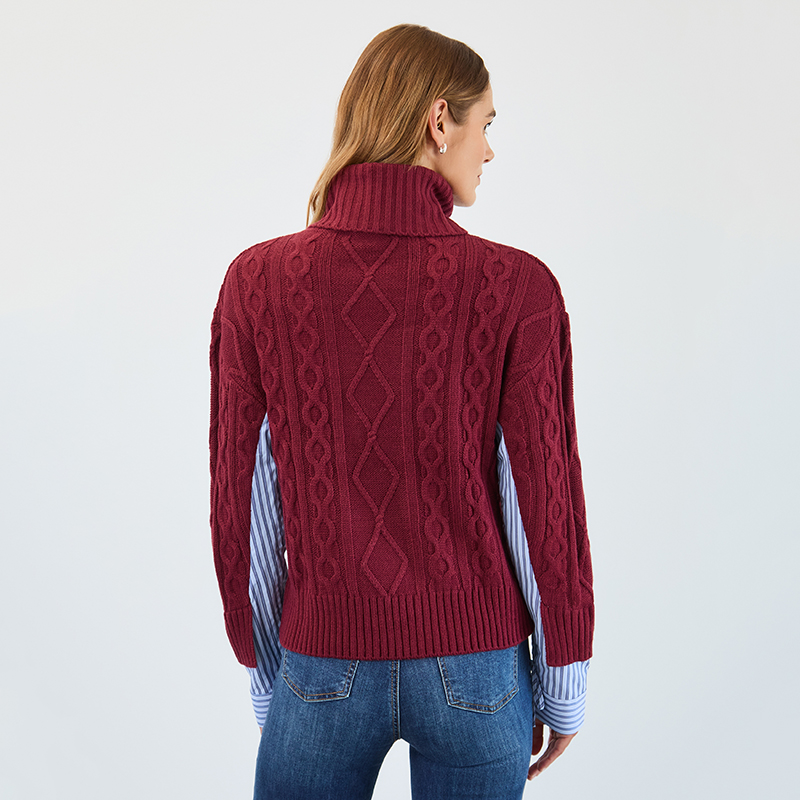 Chandail en tricot câblé à manches longues avec col roulé baveux.