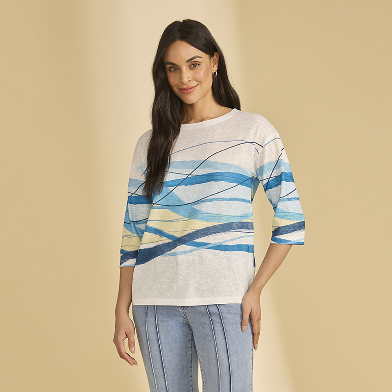Chandail en jersey léger à manches 3/4, coutures d’épaules basses, encolure ronde.