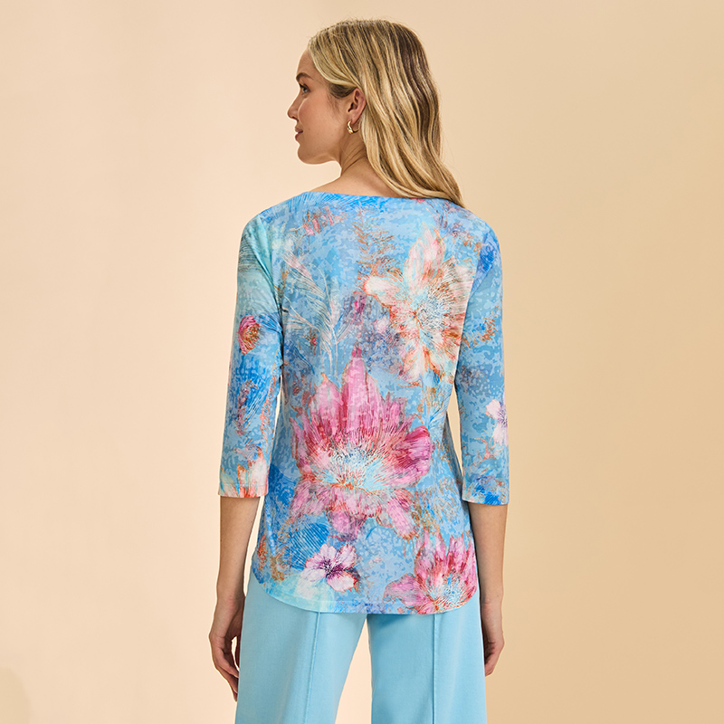 Modèle droit arrondi au bas, bleu imprimé floral.