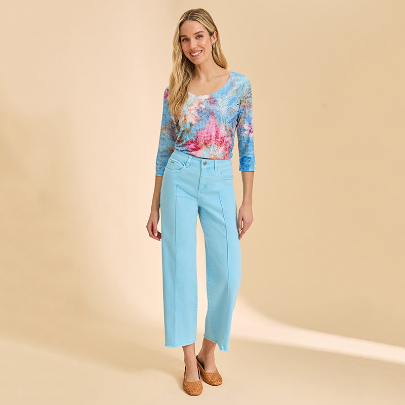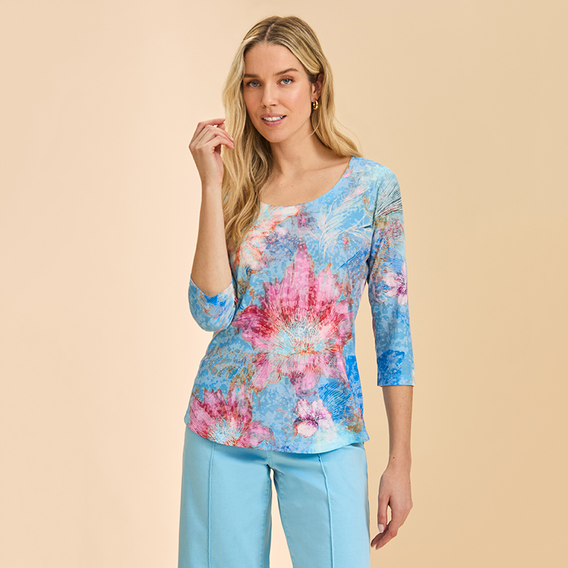 Chandail en jersey léger à manches 3/4, encolure ronde dégagée.