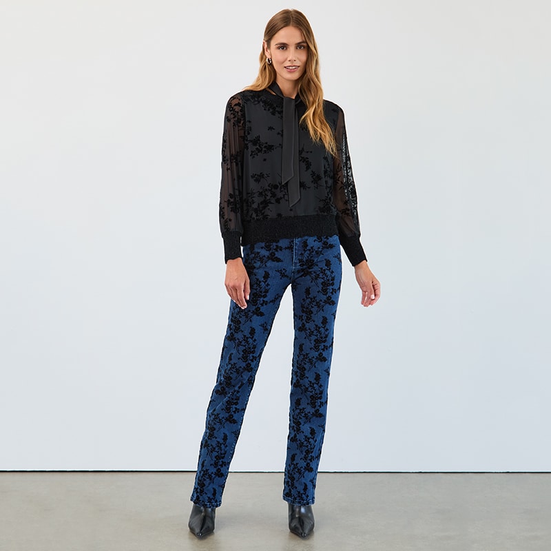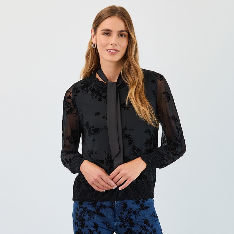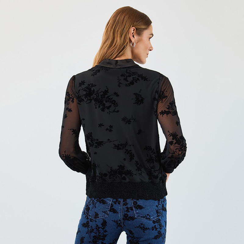 Chandail court en mèches doublées au corps et transparentes aux manches avec poignets larges en tricot.