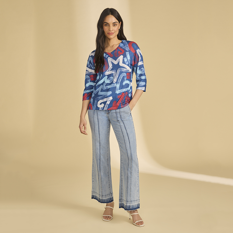 Chandail en jersey léger à manches 3/4, encolure en pointe.