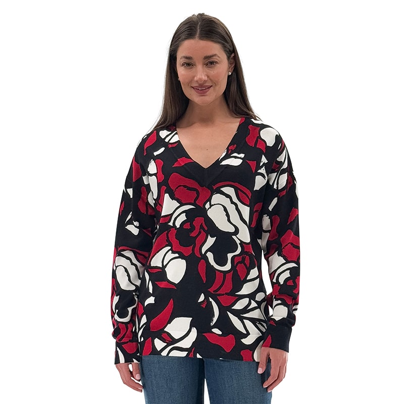 Modèle tunique ouvert de chaque côté, imprimé noir et rouge.