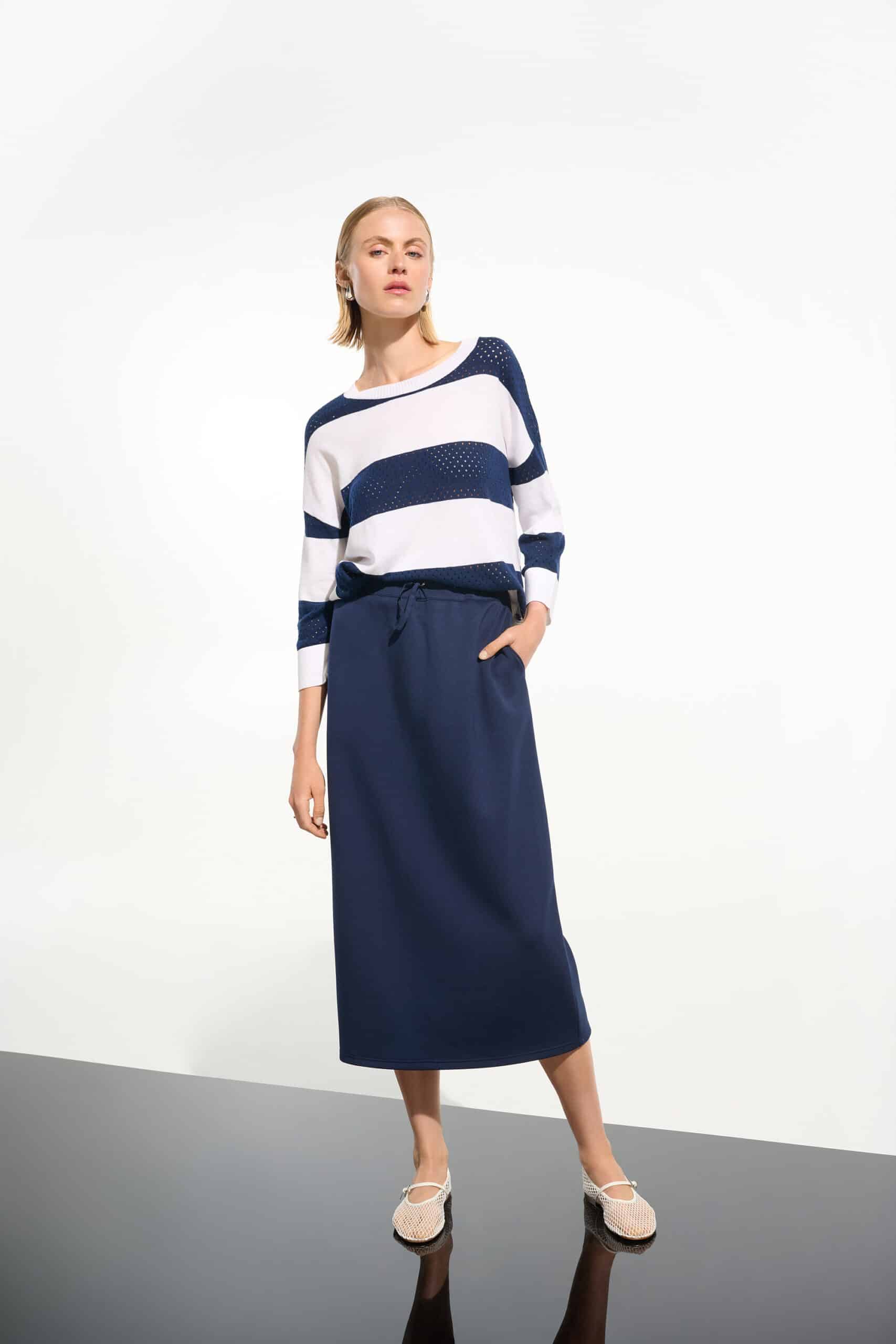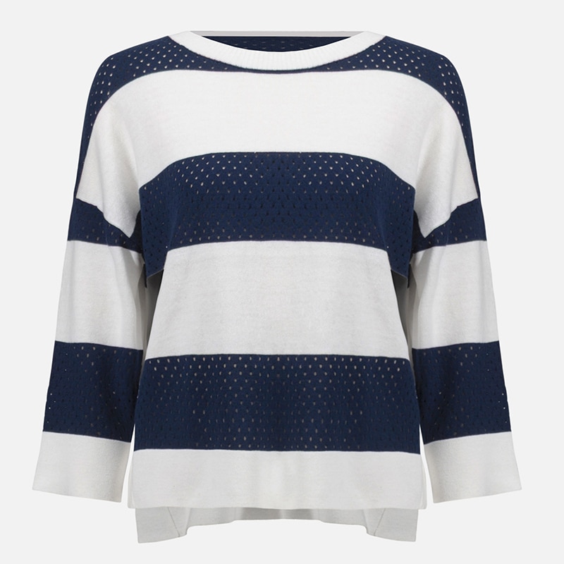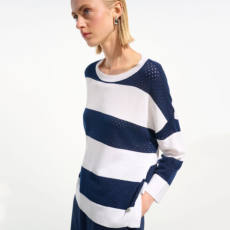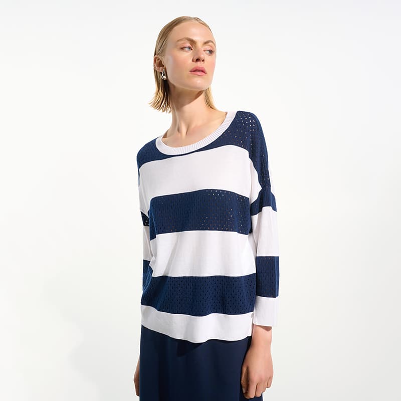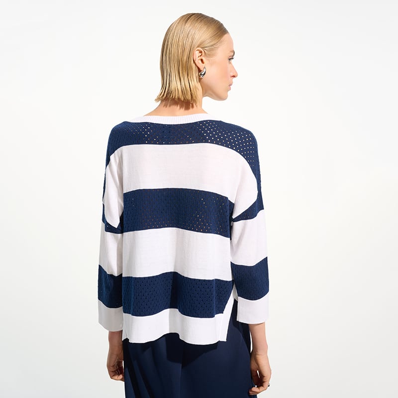 Modèle court et ample ouvert de chaque côté, rayé vanille et indigo, transparence dans la rayure marine.