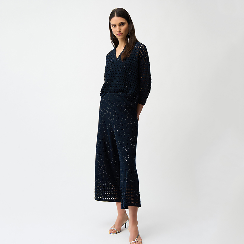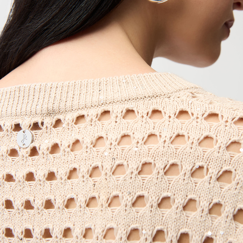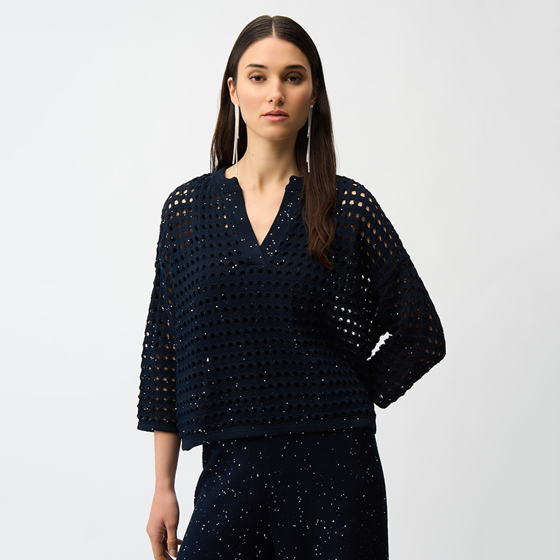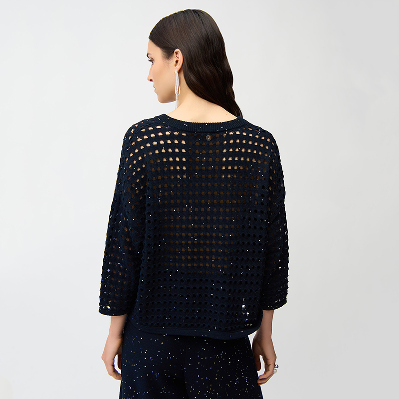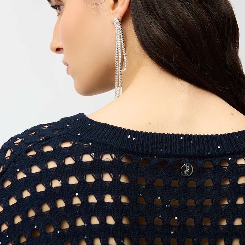 Modèle court et carré en crochet ajouré, petites paillettes ton sur ton, disponible marine ou beige.