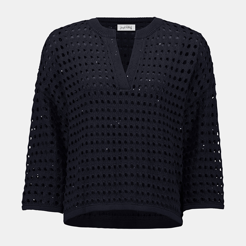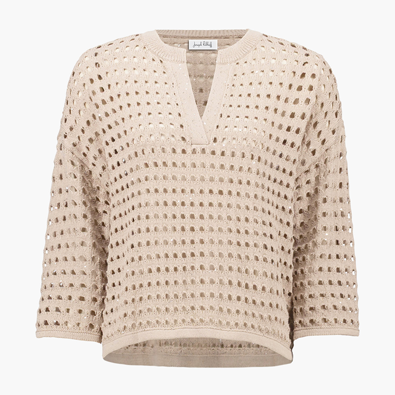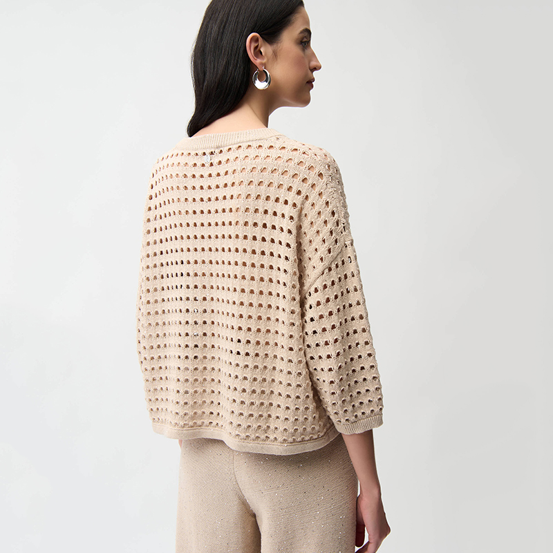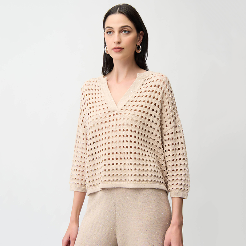 Chandail à manches 3/4 coutures d’épaules basses, encolure ronde ouvert en pointe.