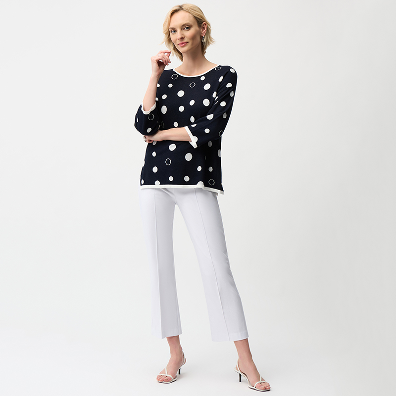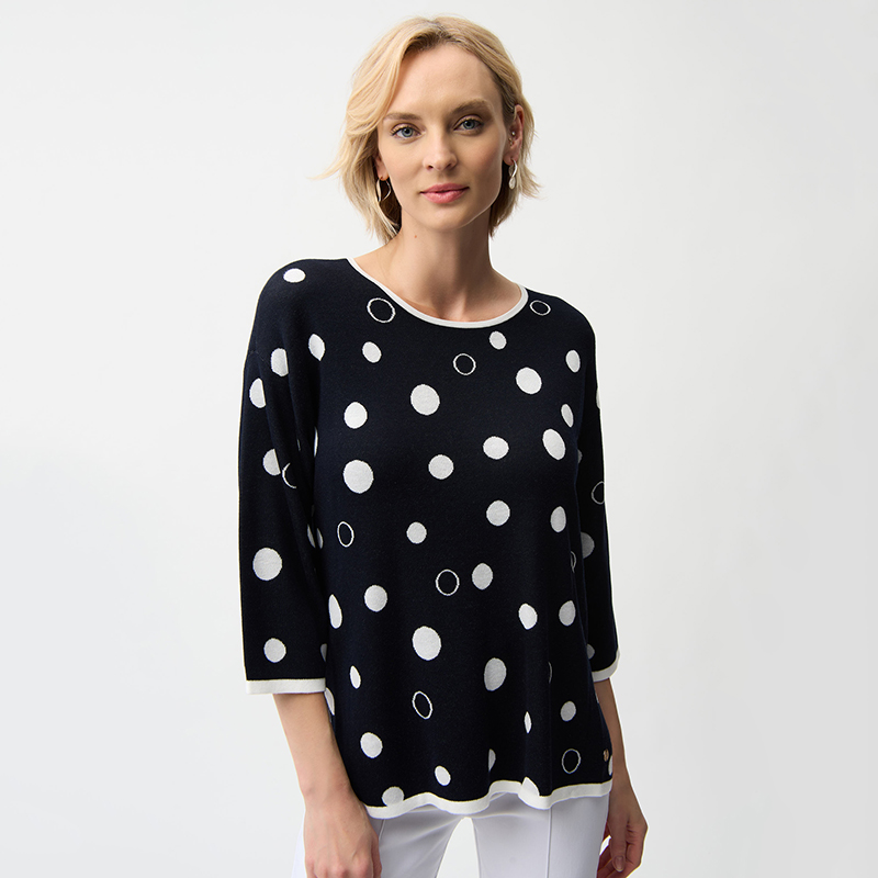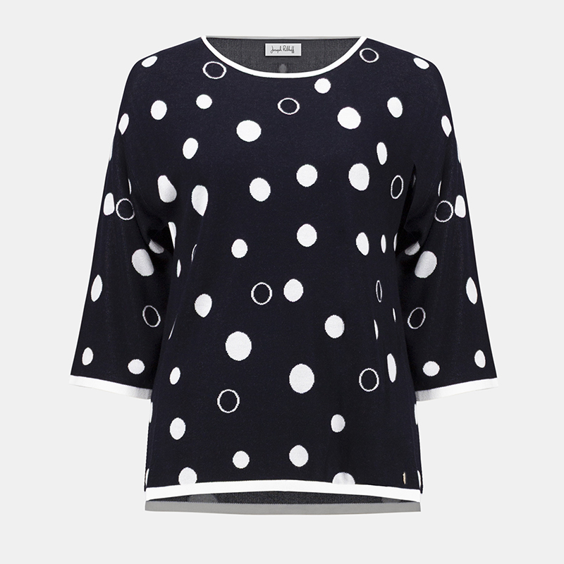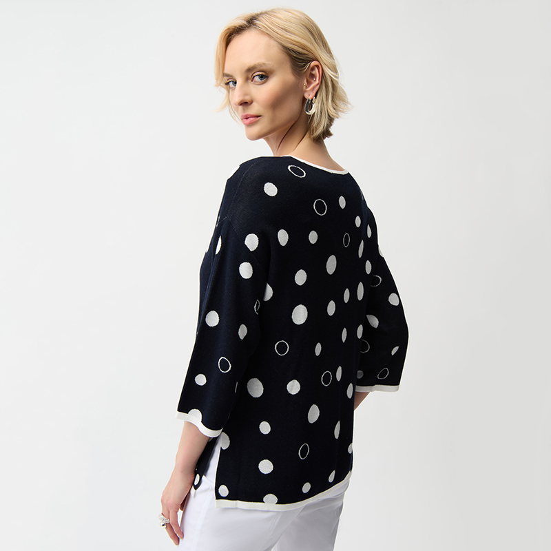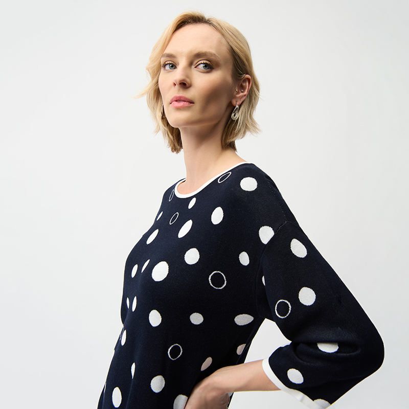 Modèle droit ouvert de chaque côté, joli motif de gros pois, marine et vanille.