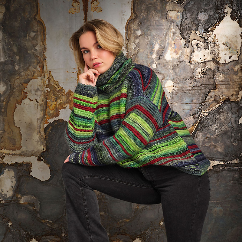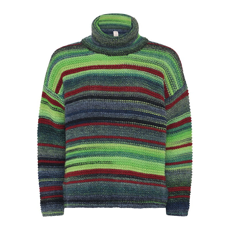 Modèle ample, coutures d’épaules basses, rayé multicolore dans des tons de bleu, rouge vin et un magnifique vert lumineux.