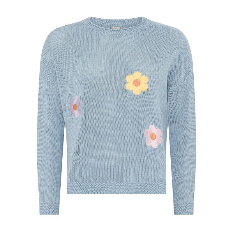 Bleu pâle avec motifs de fleurs au devant seulement, beau look printanier.