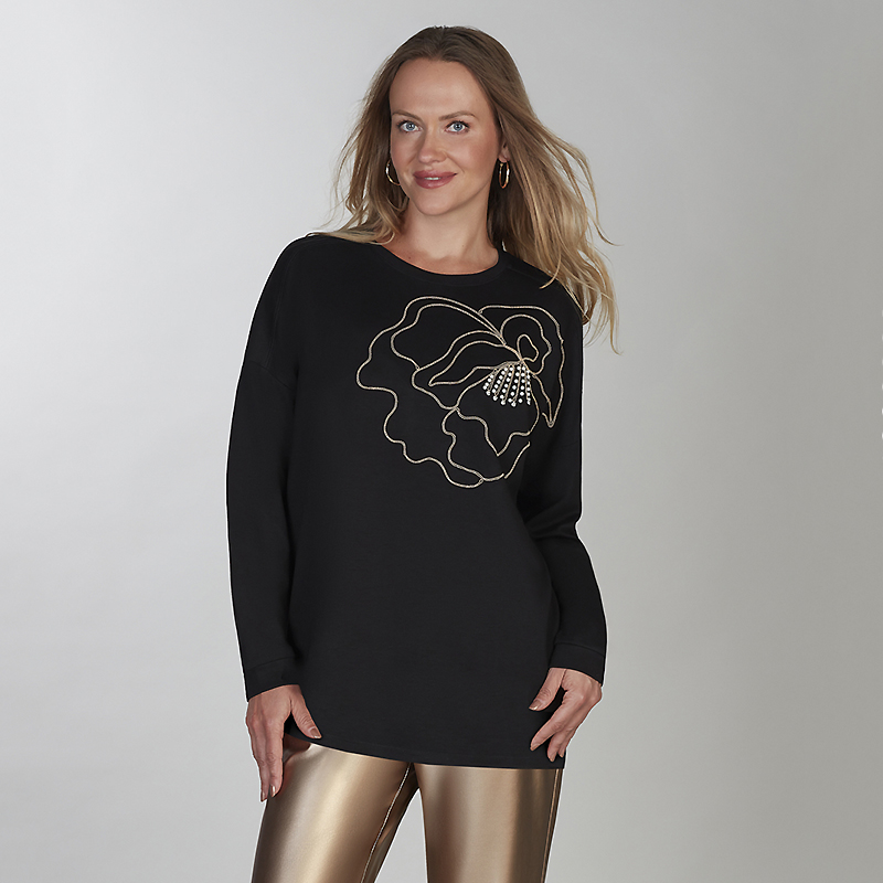 Chandail en jersey léger à manches longues, coutures d’épaules basses, encolure ronde.