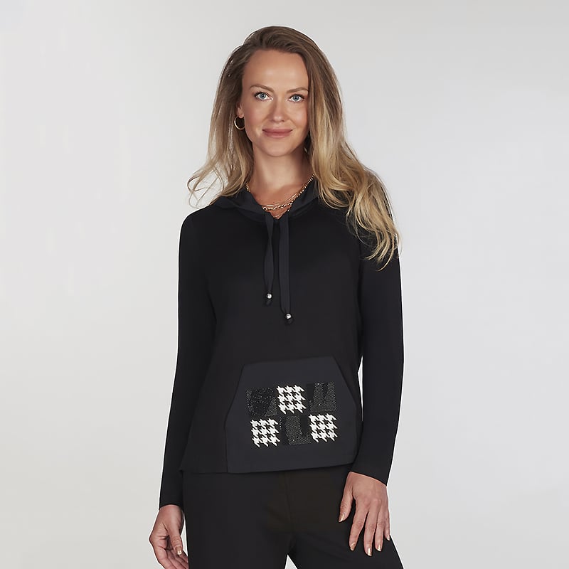 Poche kangourou orné de pierres noires et motifs en pied de poule argent, disponible noir seulement.