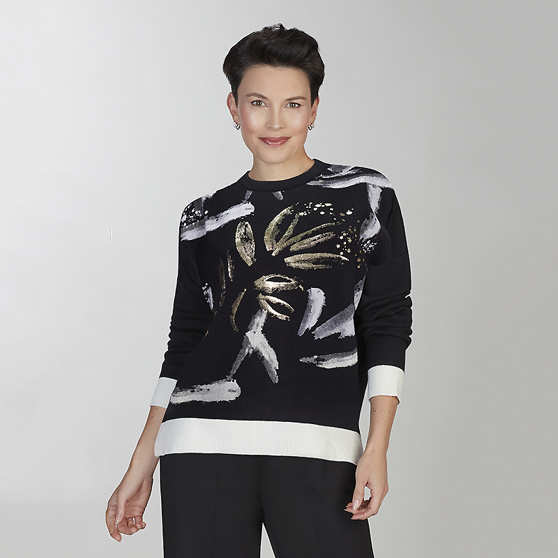 Modèle court et ample, coutures d’épaules basses, bande cossé au bas et aux poignets.